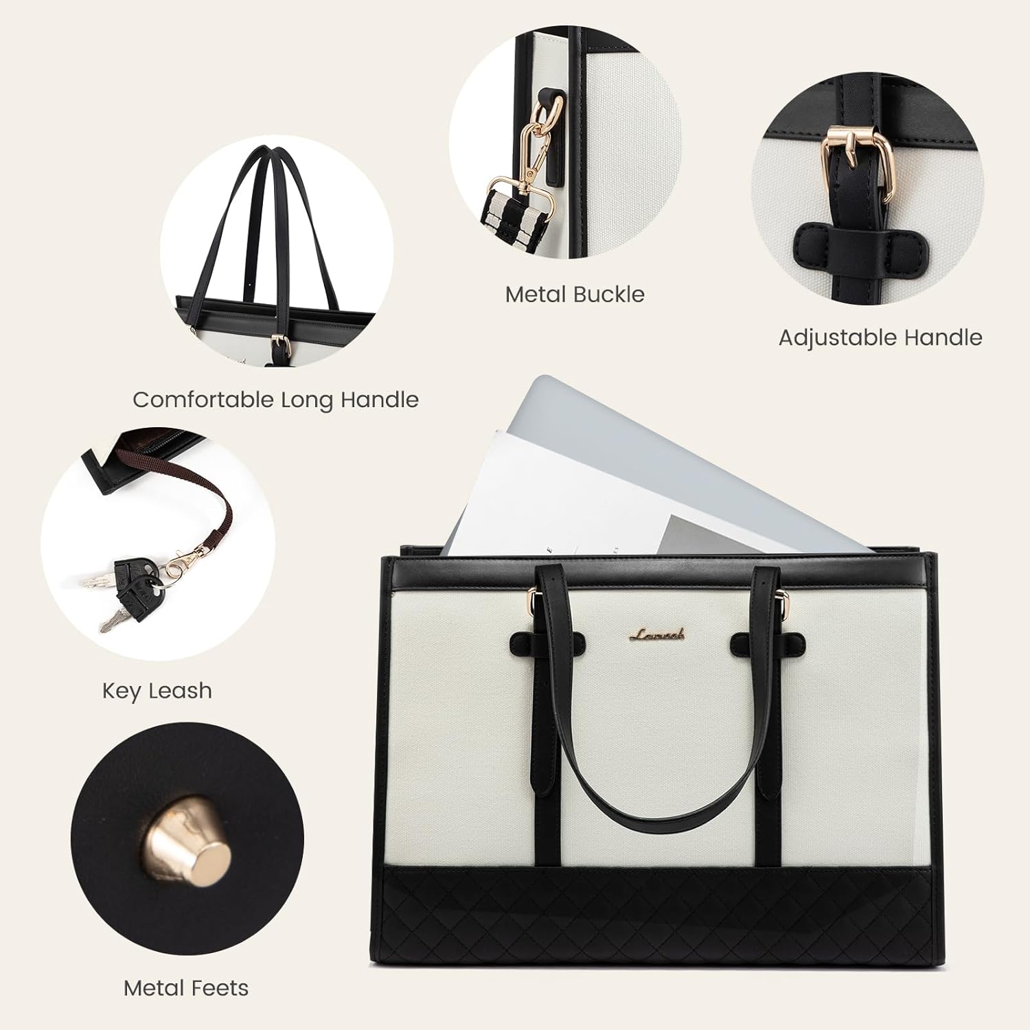 【Praktische designdetails】: deze laptoptas heeft geïntegreerde sleutelhaken, een achtervak en zijvakken aan de binnenkant, evenals penhouder voor extra opbergruimte. De metalen teennagels onderaan zorgen ervoor dat de tas slijtvast en vuilafstotend is.