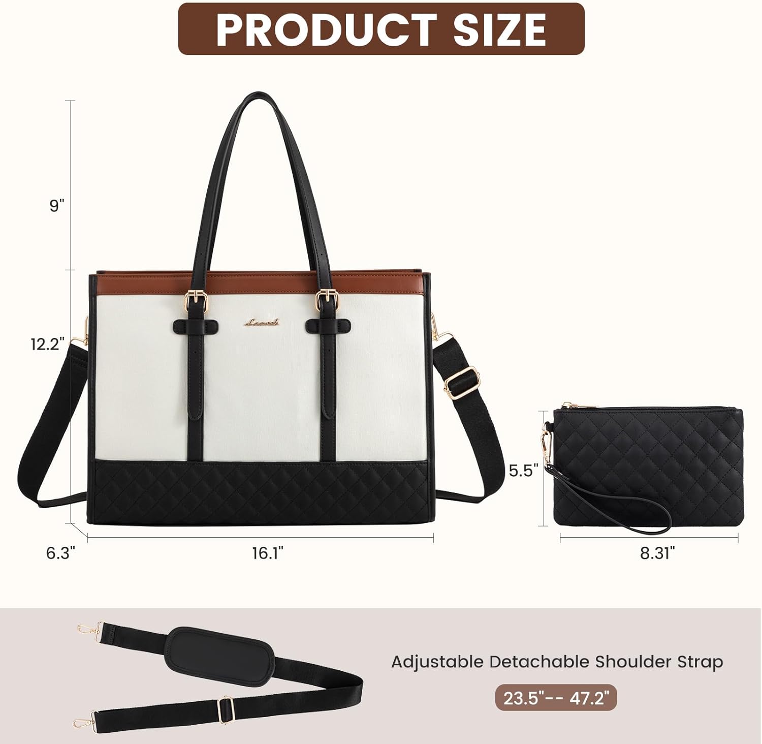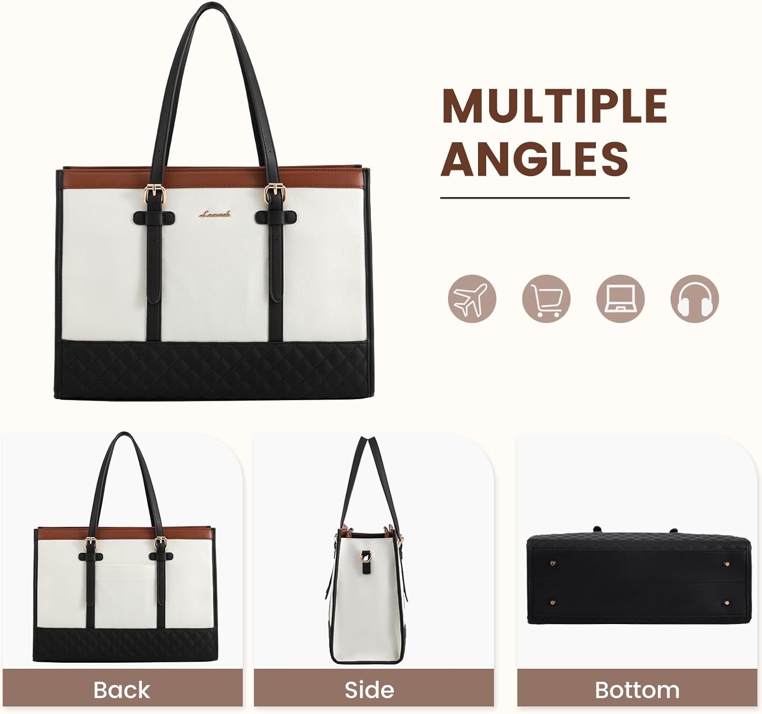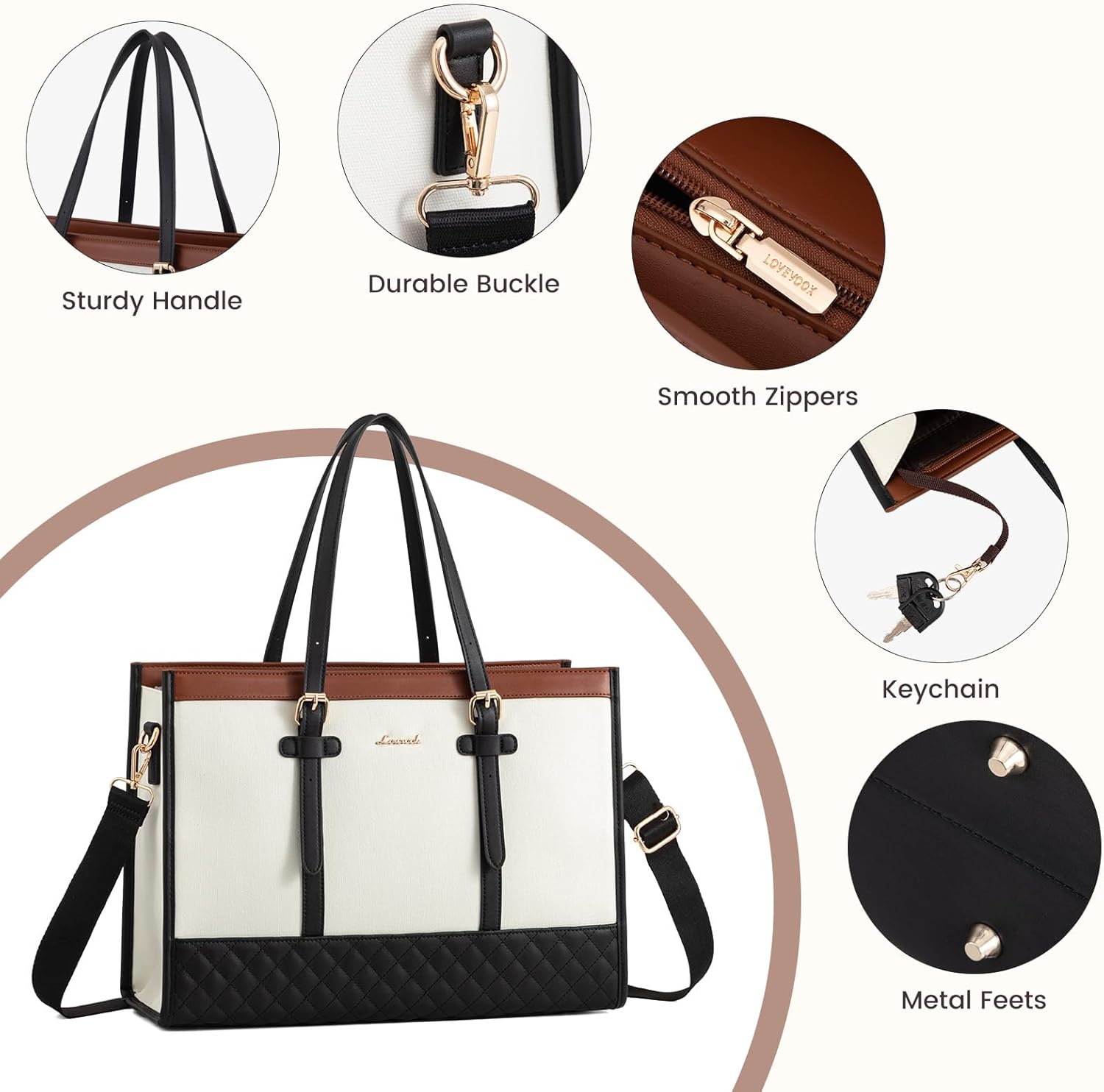 【Praktische designdetails】: deze laptoptas heeft geïntegreerde sleutelhaken, een achtervak en zijvakken aan de binnenkant, evenals penhouder voor extra opbergruimte. De metalen teennagels onderaan zorgen ervoor dat de tas slijtvast en vuilafstotend is.