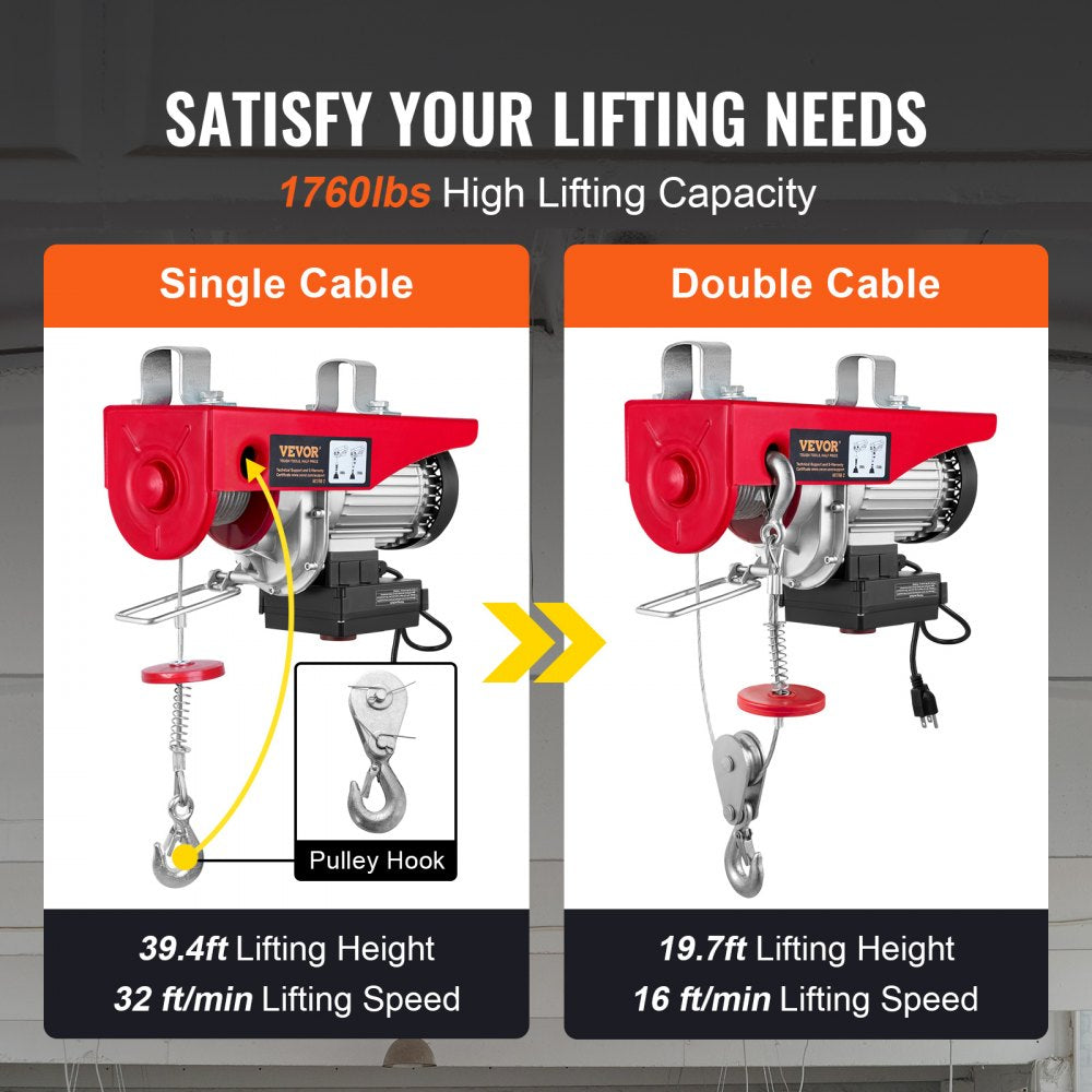 VEVOR Elektrische Lier 400 kg tot 800 kg hefhoogte 12 m Kabeltakel motorlier 1450 W koperen motorkatrol 10 m/min hijssnelheid takel met draadloze