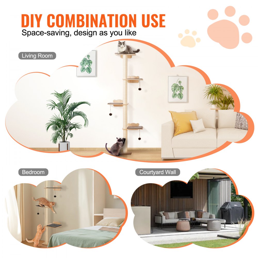Onze aan de muur gemonteerde kattenplank bevat 4 duikplanken, 4 kattenpalen en 3 speelballen en voldoet aan verschillende behoeften op het gebied van klimmen, entertainen, rusten en krabben, waardoor de speeltijd van uw kat wordt verrijkt.