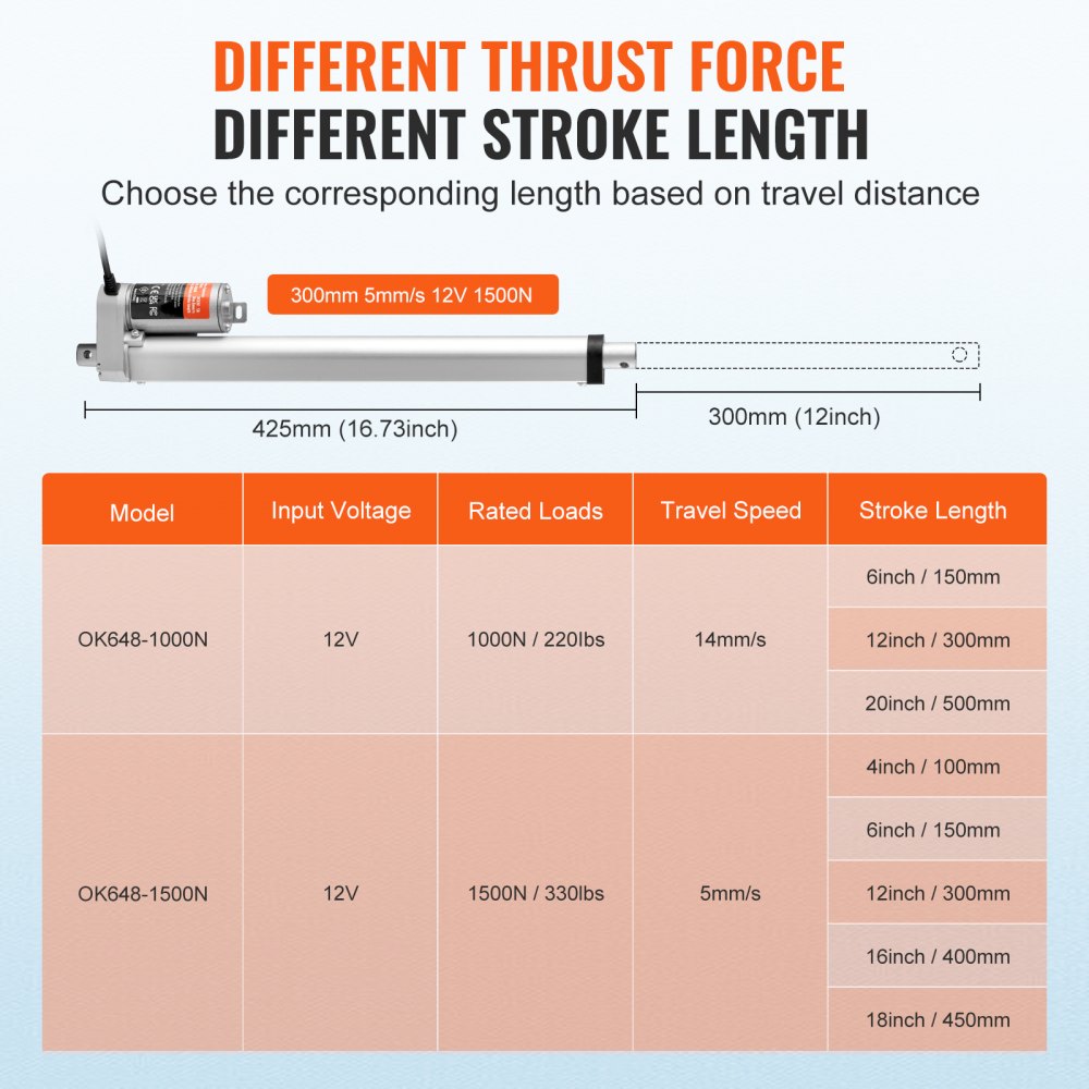 • Belangrijkste specificaties: Slaglengte: 12 inch (300 mm); Rijsnelheid: 0,19 inch/s (5 mm/s); Ingetrokken lengte: 16,73 inch (425 mm); Uitgebreide lengte: 28,73 inch (725 mm); Stroomverbruik: 5 ampère; Nominale spanning: DC12V; Inschakelduur: 25%.