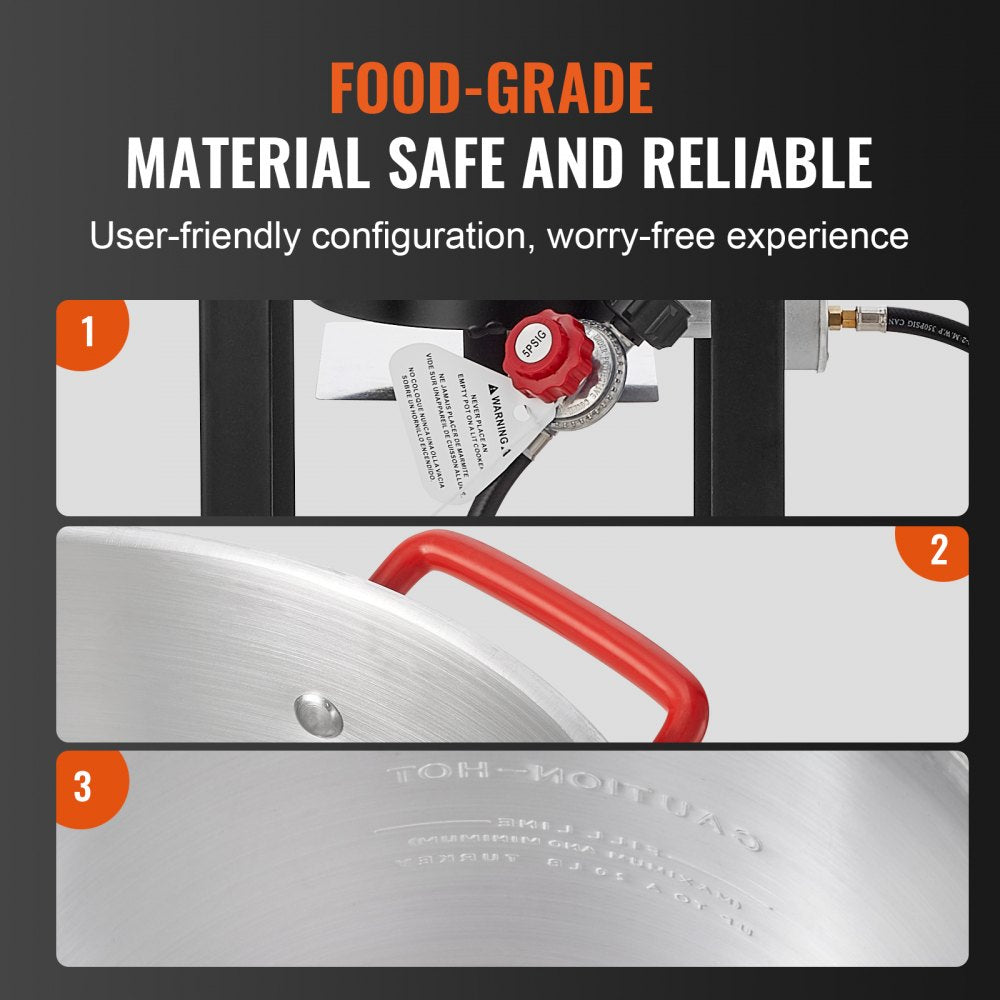 • Rijke accessoires: een accessoireset die alle problemen oplost. Accessoires zijn onder meer een pot van 30 liter, een pan van 10 liter, een deksel, een geperforeerde frituurmand/stoomboot, een thermometer, een geperforeerde kalkoenstandaard, een ophanghaak, een marinade-injector, een branderstandaard, een lagedrukslang en een regelaar. De accessoires zijn compleet, de meeste onderdelen zijn CSA-gecertificeerd, de verdikte standaard zorgt voor een veilige stand en voorkomt omvallen en de materialen van de stoompan zijn stevig en veilig.