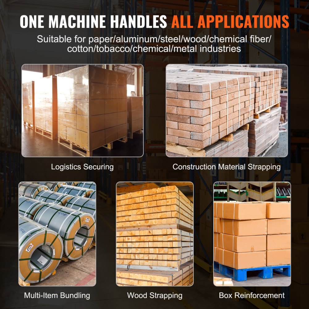 • Veelzijdige omsnoeringsmogelijkheden: Onze elektrische omsnoeringsmachine werkt uitstekend met omsnoeringsband van polypropyleen (PP) en polyester (PET). Het kan breedtes aan van 0,35 tot 0,63 inch (0,89 tot 1,6 cm) en diktes van 0,02 tot 0,05 inch (0,05 tot 0,127 cm). Dit betekent dat u eenvoudig artikelen van verschillende afmetingen en gewichten kunt verpakken en kosten kunt besparen door de juiste tape voor de klus te kiezen.