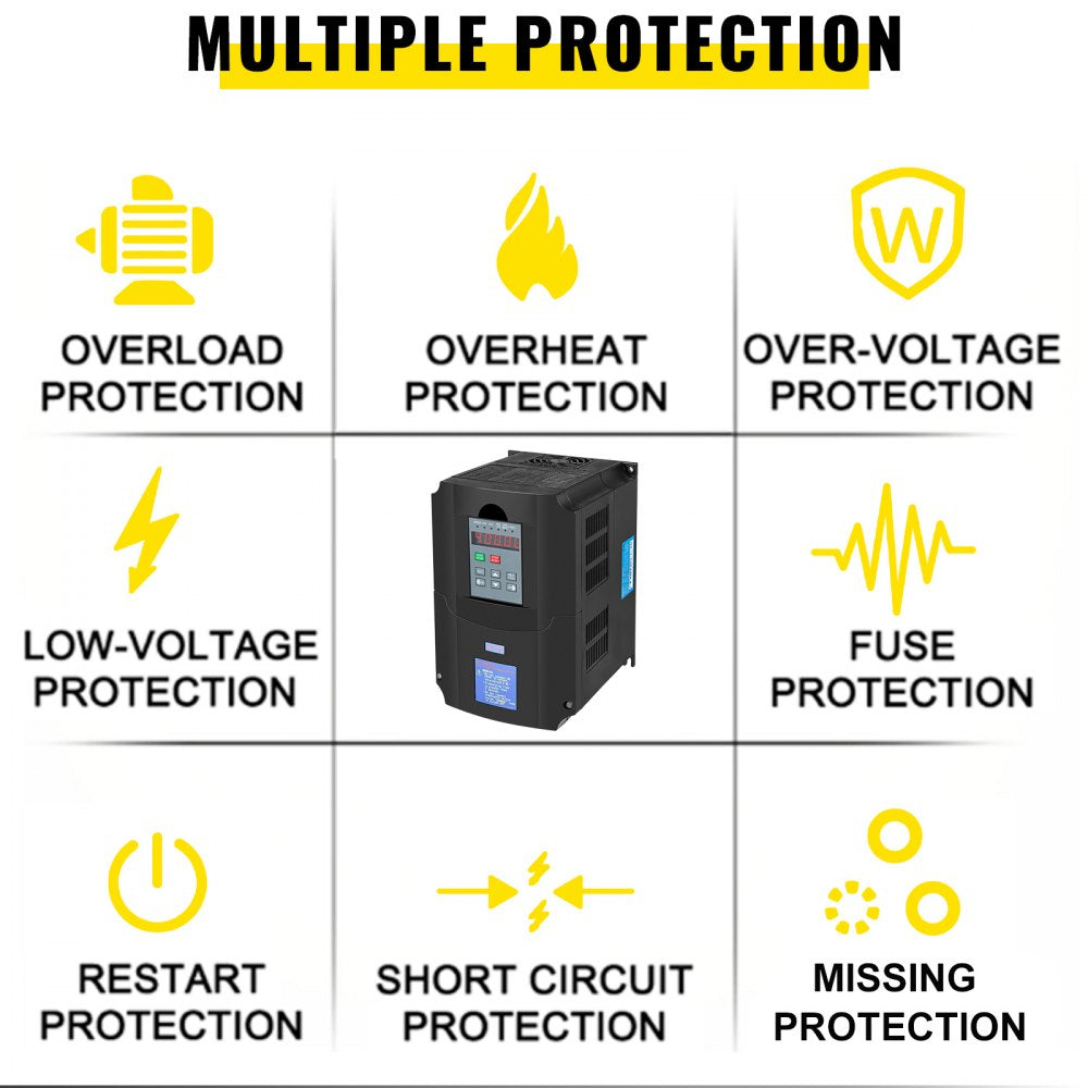 Deze VFD kan worden gebruikt voor constante koppelbelastingen (zoals hard starten: luchtcompressoren, HVAC-units) en variabele koppelbelastingen (zoals pompen, ventilatoren, enz.). Het kan worden gebruikt als motortoerentalregeling en als faseomvormer. De ingang voor deze VFD is 1 of 3 fasen zoals u wilt. U kunt de verschillende snelheden naar wens regelen wanneer u deze VFD gebruikt. Dit item gebruikt Sinusgolf PWN (SPWM) voor het besturingssysteem en de prestaties uitstekend.