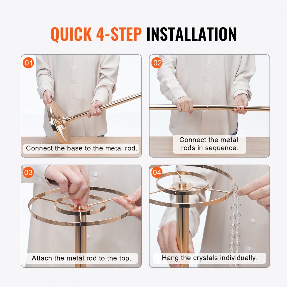 Installatie zonder gereedschap, zonder de noodzaak van extra gereedschap of professionele vaardigheden. Het proces van het installeren van bruiloftsbloemenstandaards is sneller en handiger, zonder tijdrovende en vervelende montage, waardoor tijd en moeite worden bespaard.