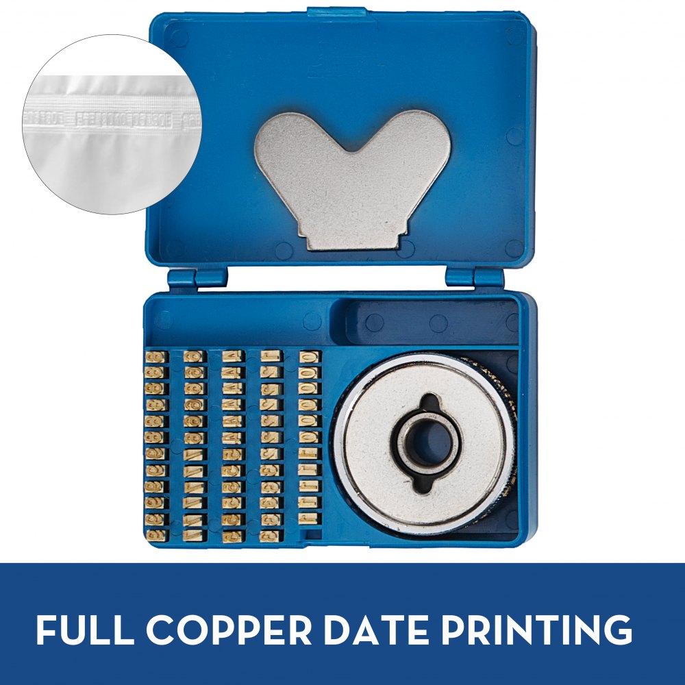 Een volledig koperen wiel met letters en cijfers beschikbaar. Hiermee kunt u de productiedatum, productietijd, etc. op de verpakking afdrukken. De machine is uitgerust met een reliëfwiel en een afdrukwiel en u kunt het type vervangen.