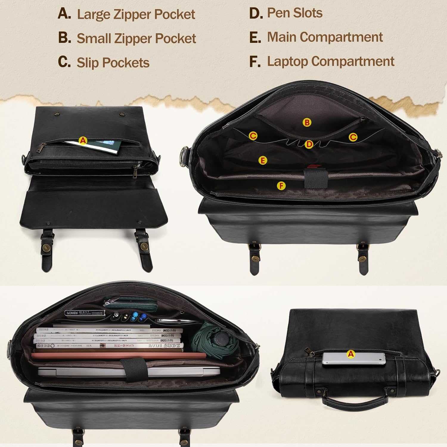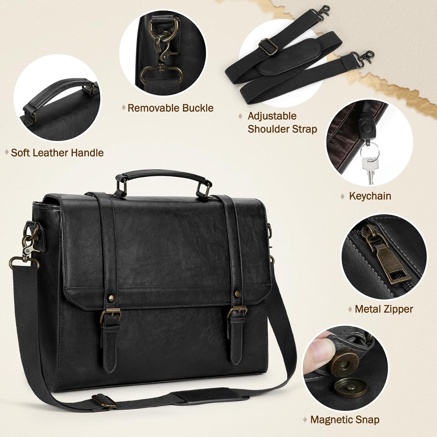Hoogwaardig materiaal: de IGOLUMON aktetas voor heren is gemaakt van hoogwaardig waterdicht PU-leer met rundleerpatroon over de hele lengte, met antieke messing metalen gespen en ritssluitingen, hij is zeer vintage en modieus.