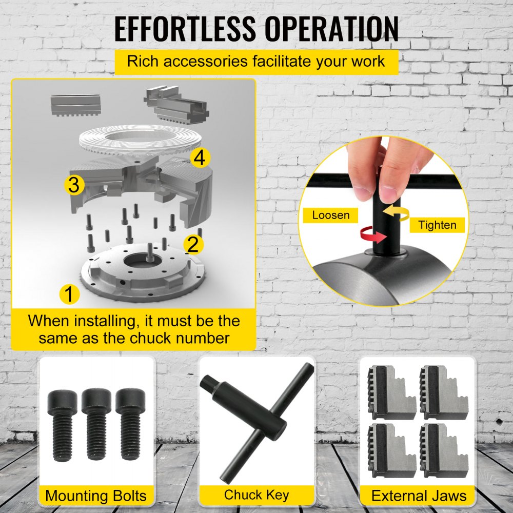 Deze klauwplaat met 4 klauwen wordt geleverd met twee sets klauwen, een set massief stalen interne klauwen en een set massief stalen externe klauwen; drie bevestigingsbouten; en één veiligheidssleutel voor uw gemakkelijke bediening.