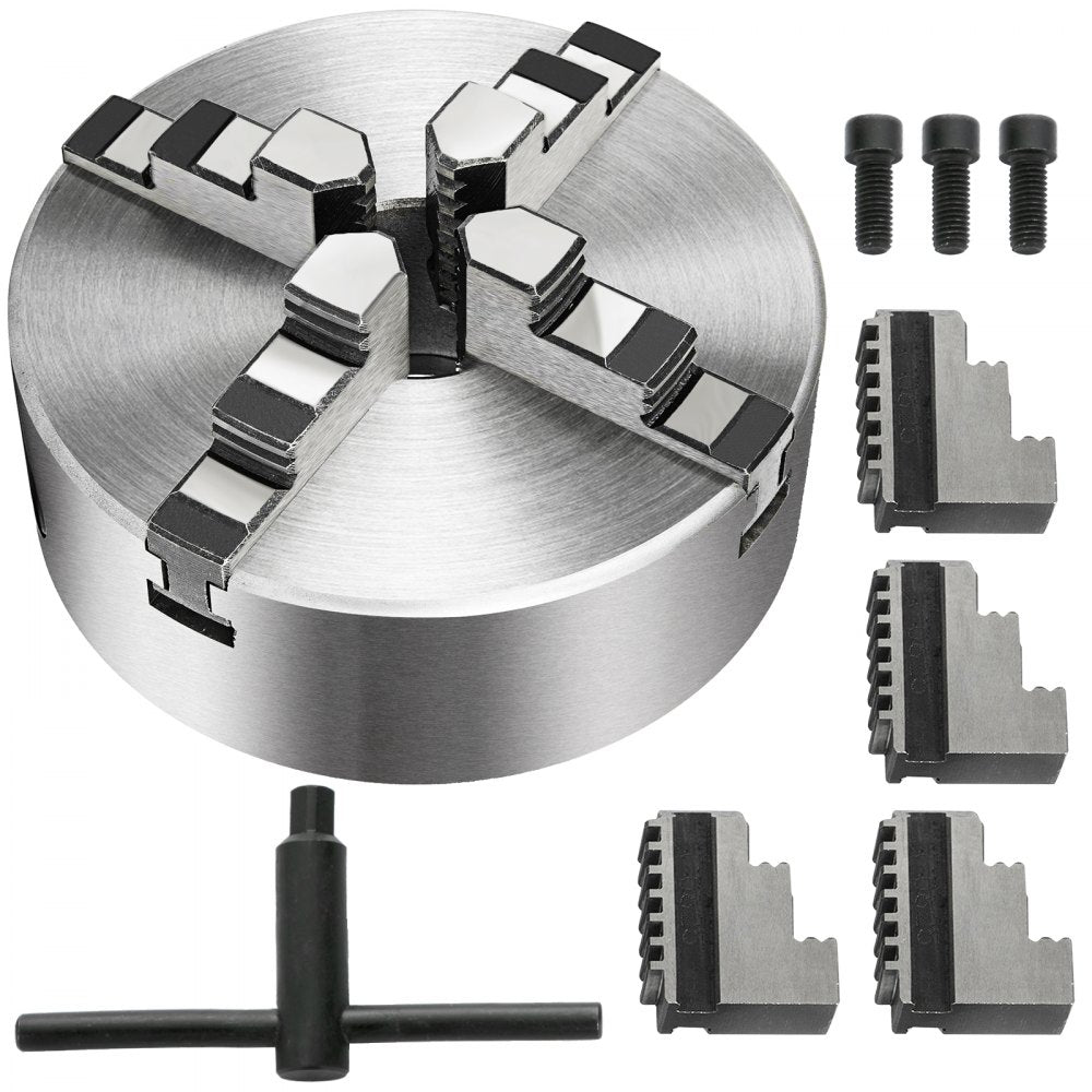 Deze veelzijdige klauwplaat is gemaakt van hoogwaardig gehard staal, drukvast en heeft een lange levensduur. Deze boorkop is een korte conische verbinding met een hoge centreernauwkeurigheid, goede stijfheid en korte uitsteeklengte. Deze rolkop heeft twee sets interne en externe kaken, die industriële onderdelen in het bereik van 0,12" - 6,3" / 3 - 160 mm kunnen bevatten. De 4-klauwplaat heeft een groot klembereik en een sterke klemkracht en is geschikt voor industriële onderdelen met complexe vormen.