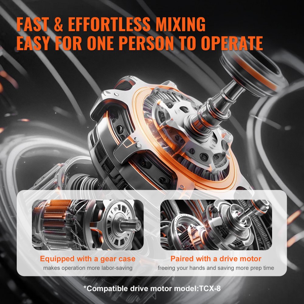 Het tandwielontwerp maakt het mengen minder arbeidsintensief. In combinatie met de VEVOR aandrijfmotor TCX-8 heb je je handen vrij en kun je sneller en gelijkmatiger mixen.