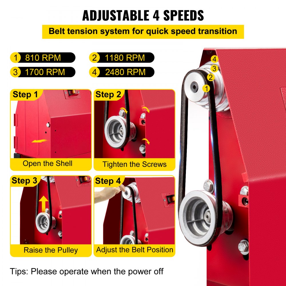 • 4 Hellingssnelheden: De verstelbare riemen kunnen gemakkelijk en nauwkeurig worden afgesteld binnen 2480 RPM, 810, 1180, 1700, 2480 RPM beschikbaar. U kunt de juiste snelheid aanpassen aan de grootte van de werkstukken.