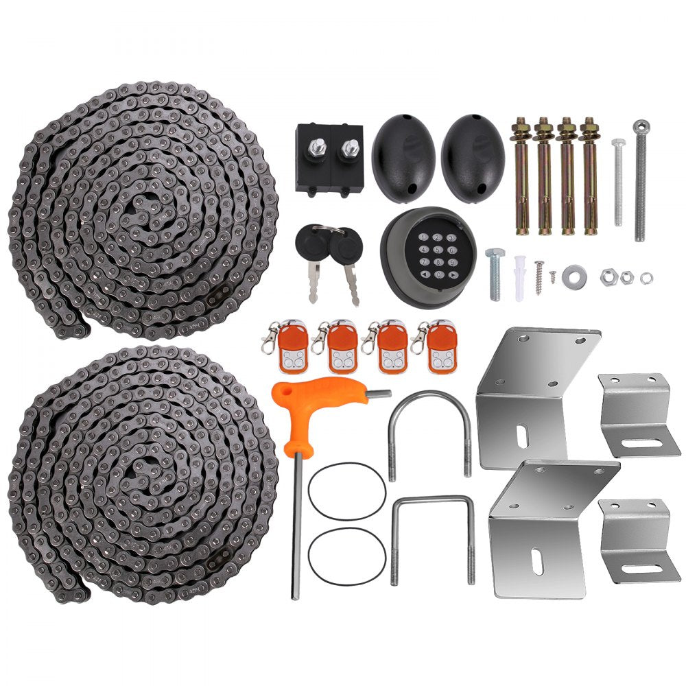 VEVOR-onderdelen voor schuifpoortopeners, waaronder kettingen, afstandsbedieningen, beugels en hardware.