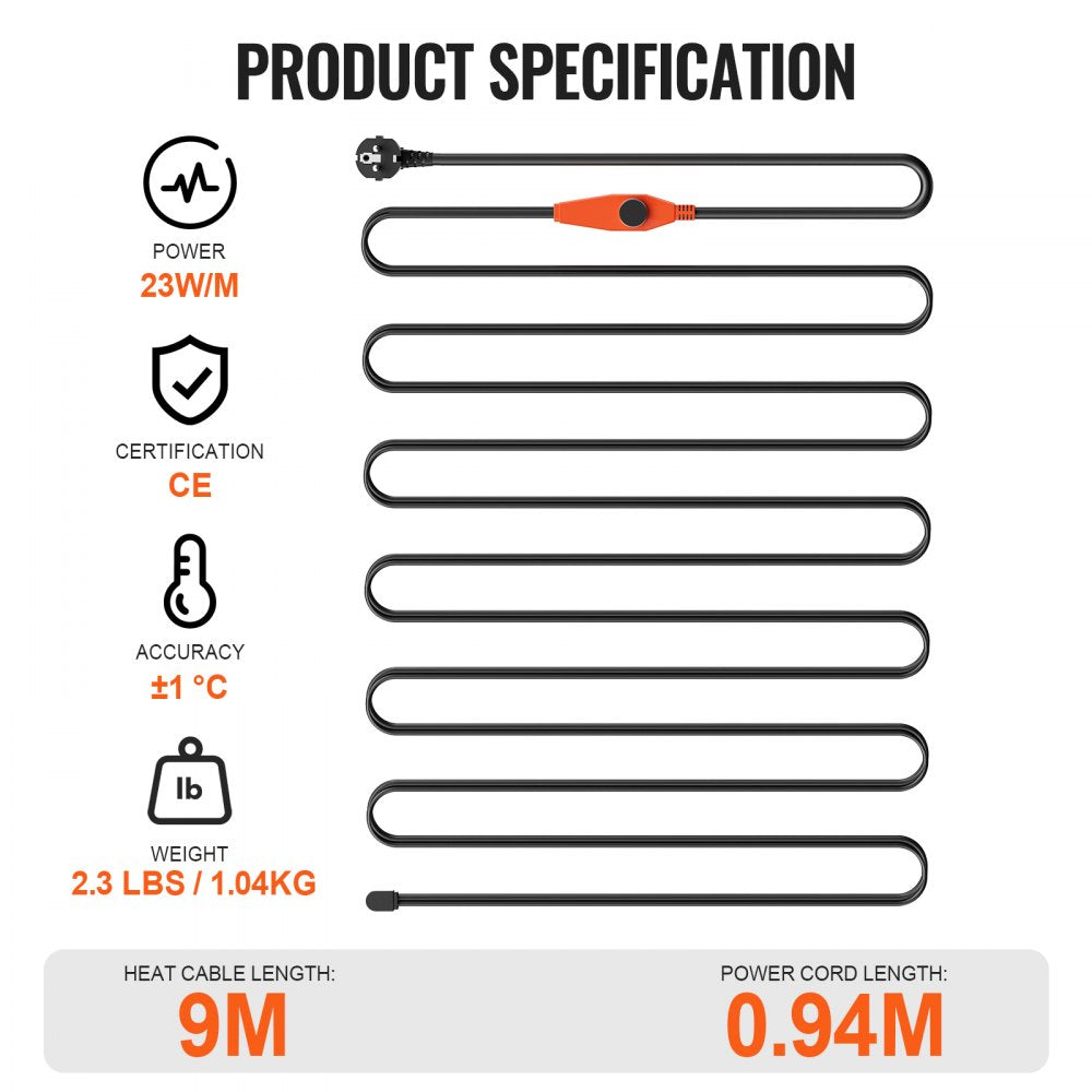 VEVOR buisverwarmingskabel 9m 23W/m buisverwarmingskabel vorstbeveiligingsthermostaat