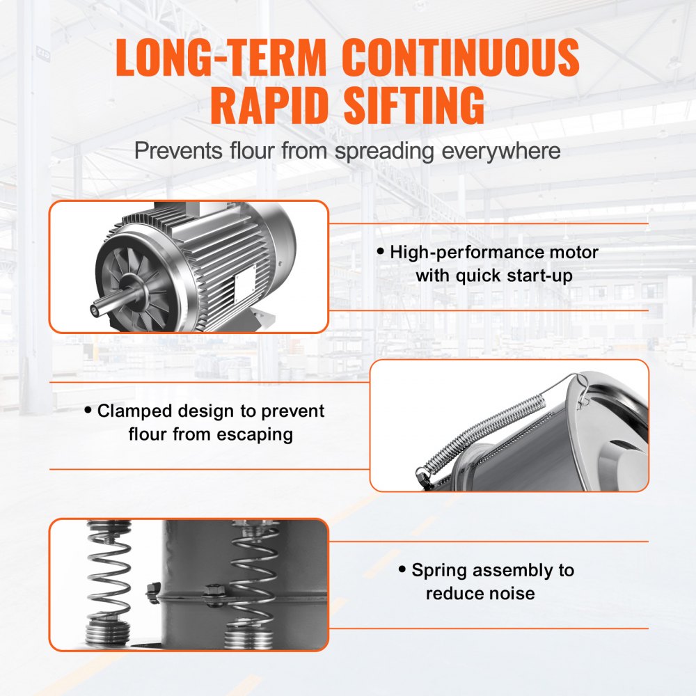 • Hoog rendement zeven: Uitgerust met een krachtige motor die snel start en gedurende langere tijd continu kan draaien. De hoogwaardige veerconstructie vermindert effectief het geluid en zorgt voor een stabiele, trillingsvrije werking. De sterke afdichting voorkomt dat poeder wegvliegt of vloeistoffen lekken, waardoor het geschikt is voor het zeven van voedselpoeders, traditionele Chinese medicijnpoeders, vloeistoffen, chemicaliën en meer.