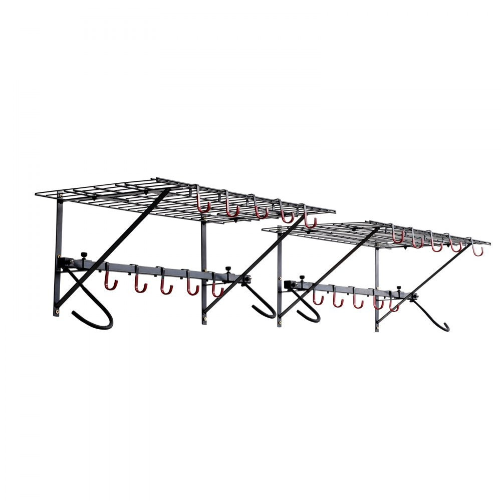 • Verstelbare afstand: de fietswandhouder heeft een ontwerp met verstelbare afstand, waardoor de driehoekige steunbeugels zijwaarts kunnen bewegen. Met dit ontwerp kunt u de afstand tussen de beugels aanpassen aan verschillende soorten fietsen. Daarnaast is de houder voorzien van planken voor het opbergen van helmen, pompen, reparatiesets etc.