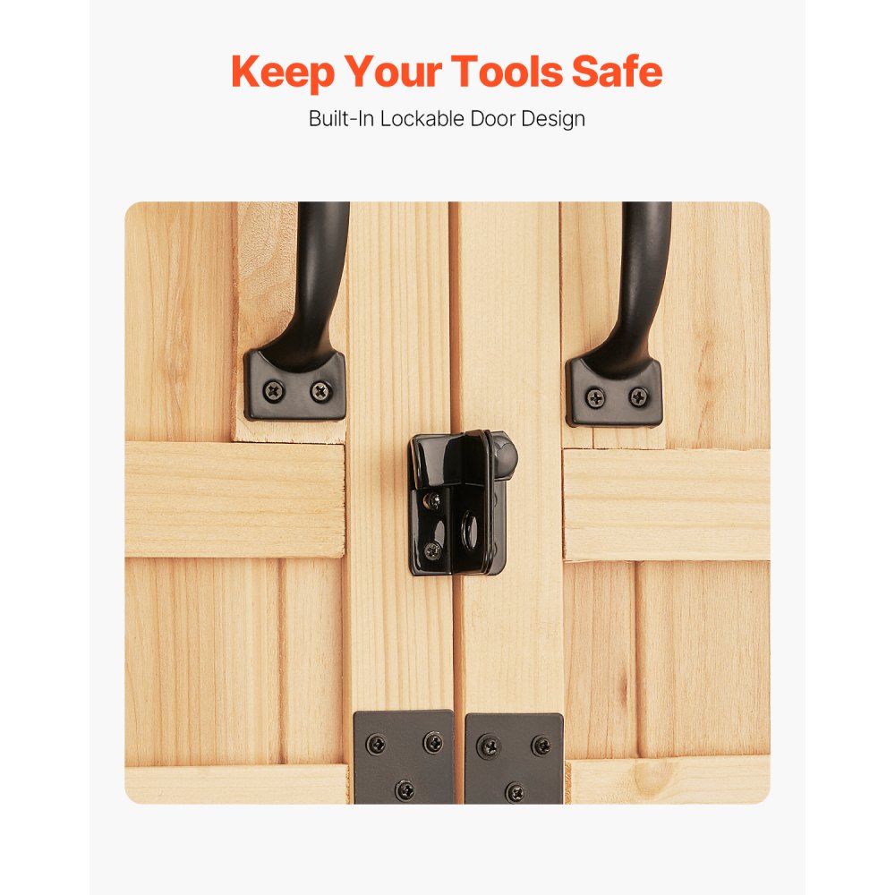 De grote houten buitenopslag is ontworpen met flexibele opslagruimte en biedt plaats aan een verscheidenheid aan gereedschappen, waardoor ze gemakkelijk te organiseren en snel toegankelijk zijn.