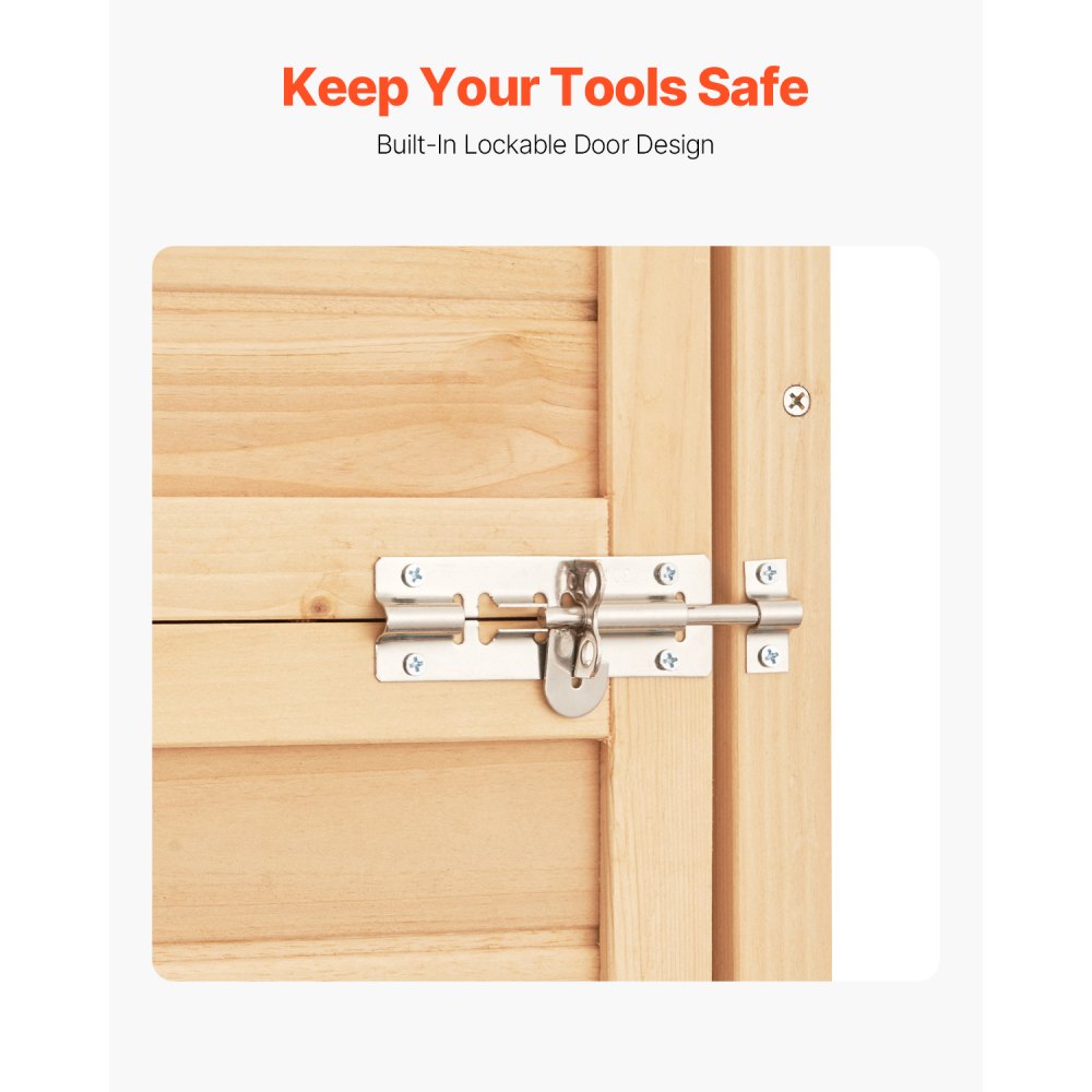 De grote houten buitenopslag is ontworpen met flexibele opslagruimte en biedt plaats aan een verscheidenheid aan gereedschappen, waardoor ze gemakkelijk te organiseren en snel toegankelijk zijn.