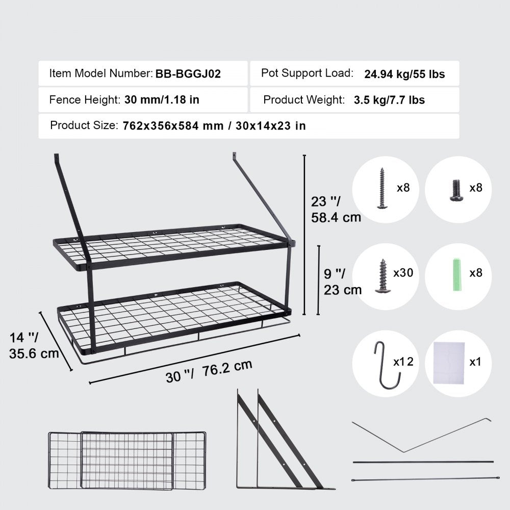 VEVOR pannenrek met afmetingen 30x14x23 inch, draagvermogen 55 lbs, inclusief schroeven en haken.