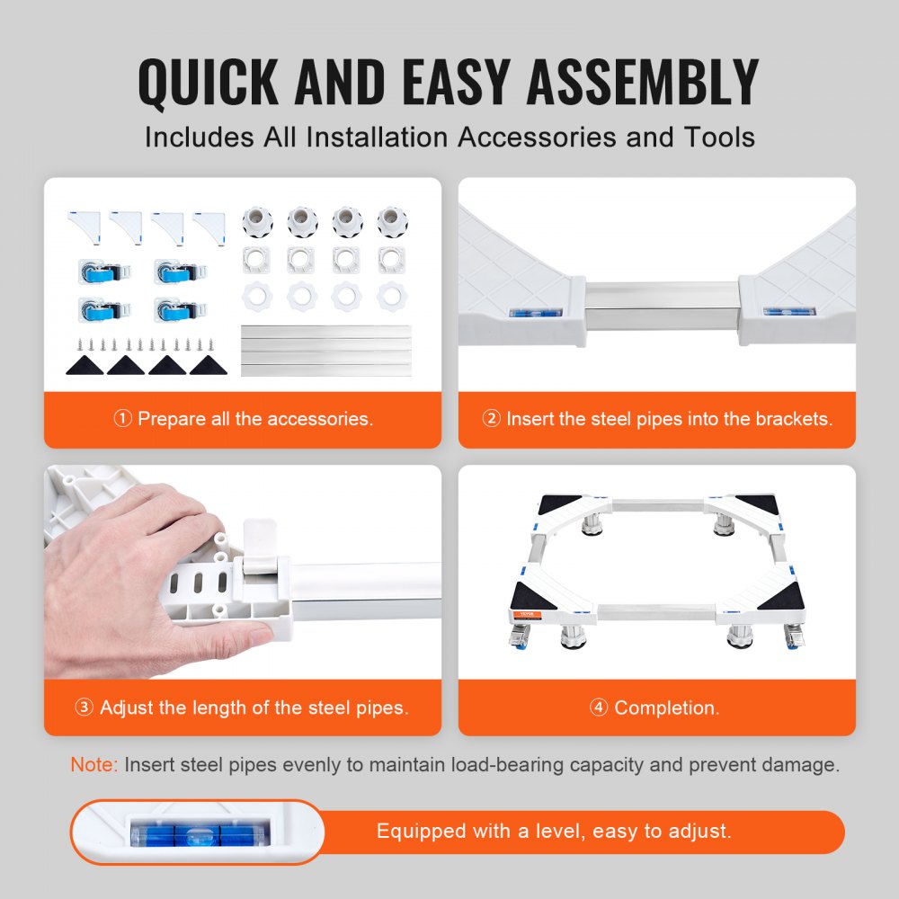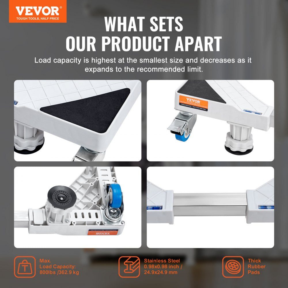 De uittrekbare wasmachinebasis met versterkte roestvrijstalen buizen ondersteunt een minimale belasting van 800 pond (362,9 kg) en een maximale belasting van 330 pond (149,7 kg) in zijn kleinste formaat. Ideaal voor het optillen van diverse huishoudelijke apparaten.