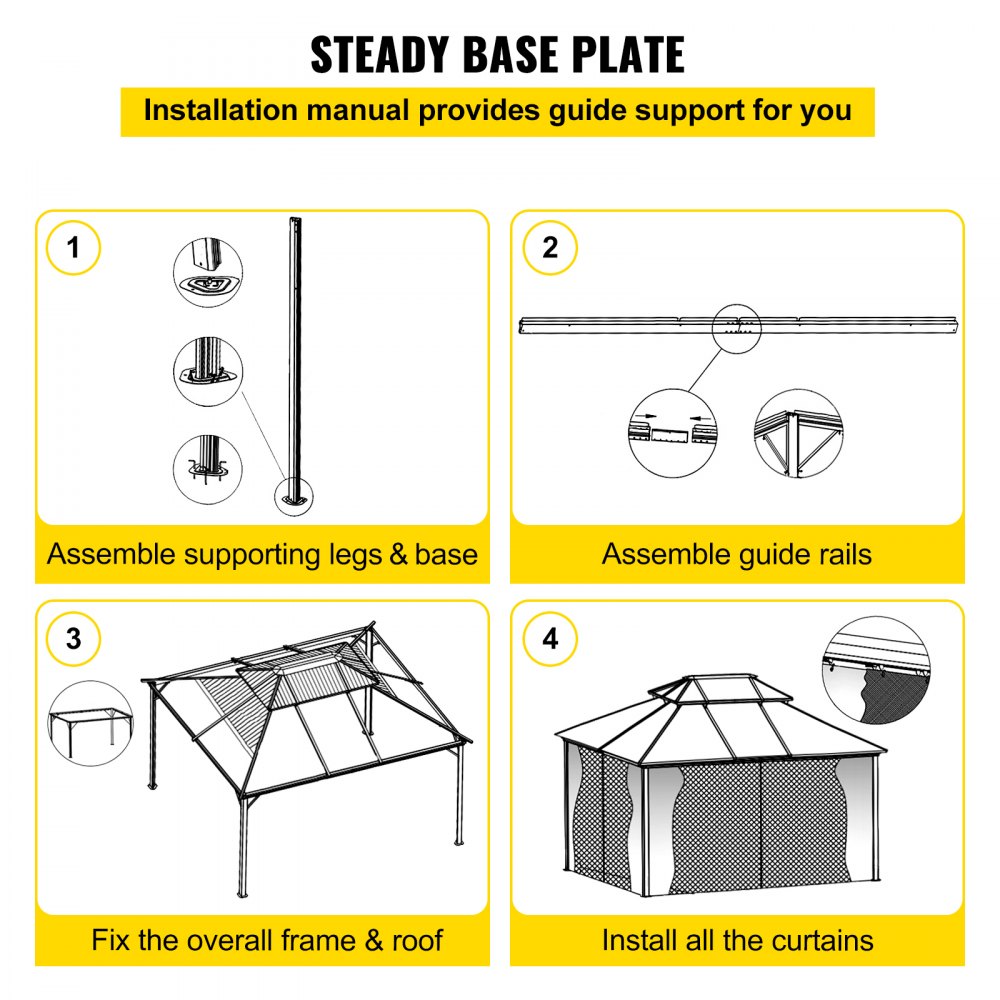 Er zijn twee of drie mensen nodig om het tuinpaviljoen te installeren. We hebben gedetailleerde installatievideo's en instructies voor uw gemakkelijke en gemakkelijke installatie.