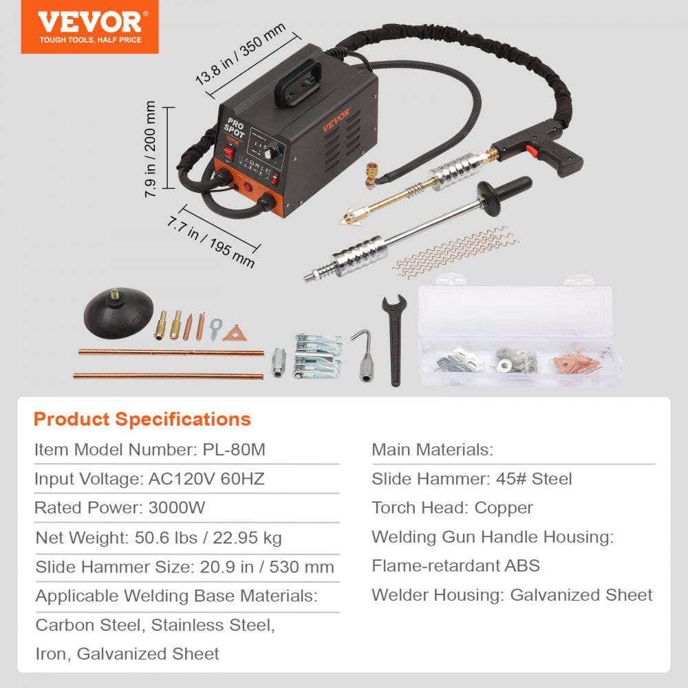 VEVOR stud welder deukreparatieset met accessoires, specificaties vermeld voor model pl-80m.