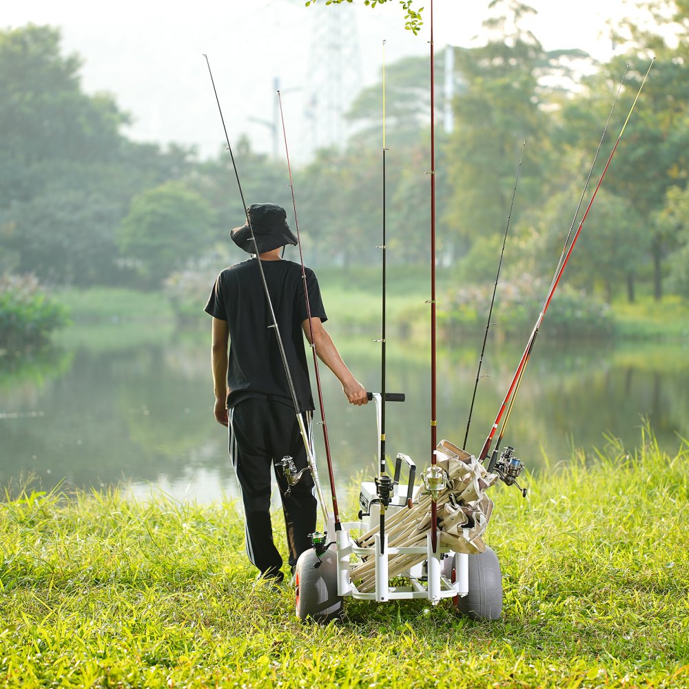 Stel je dit voor: een viskar met een stevig aluminium frame, soepel rollend op 13-inch opblaasbare PU-wielen. Met afmetingen van 34 x 14,5 x 7 inch en klaar om tot 300 lbs te dragen met 8 hengelhouders, is het uw perfecte partner voor visavonturen.
