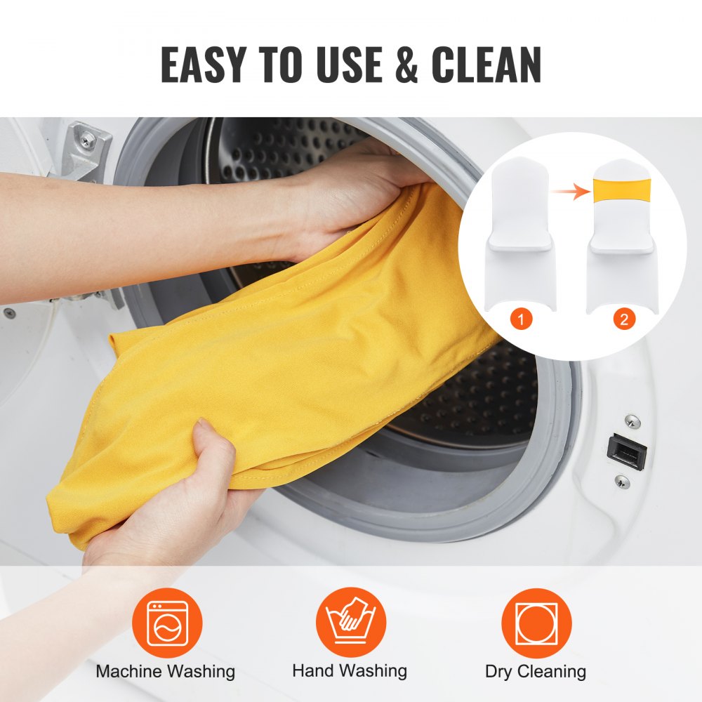 Trek hem eenvoudig over de stoelen en bevestig de vier poten. Tijd- en kostenbesparend onderhoud, strijken niet nodig. De stoelhoezen kunnen met de hand worden gewassen, in de machine worden gewassen of chemisch worden gereinigd met een mild wasmiddel.