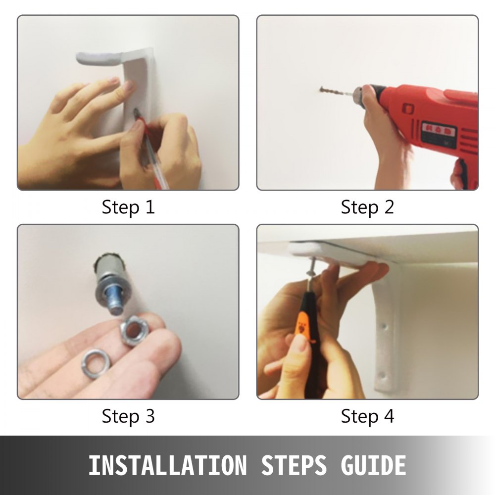 Installatiestappen voor VEVOR heavy duty plankdragers: markeren, boren, plaatsen, bevestigen.