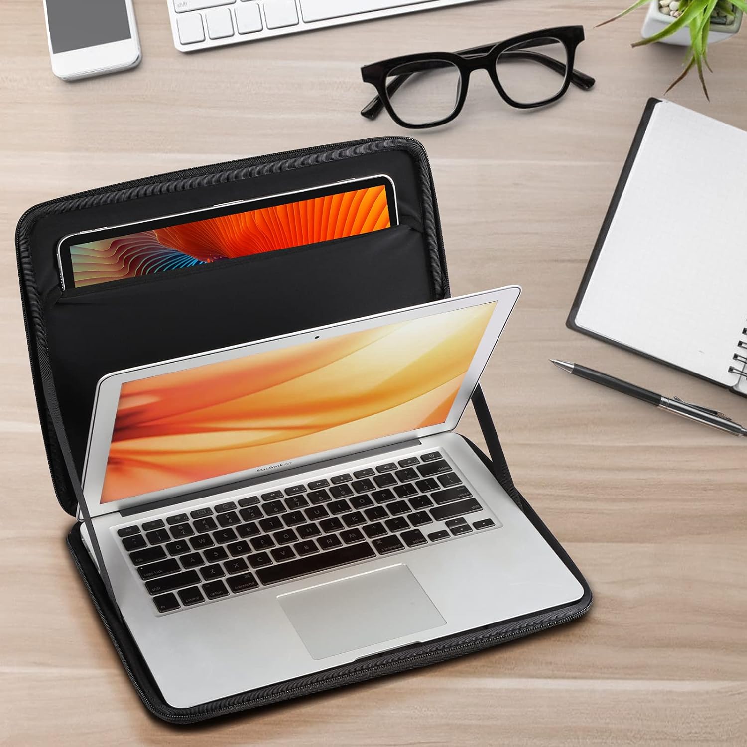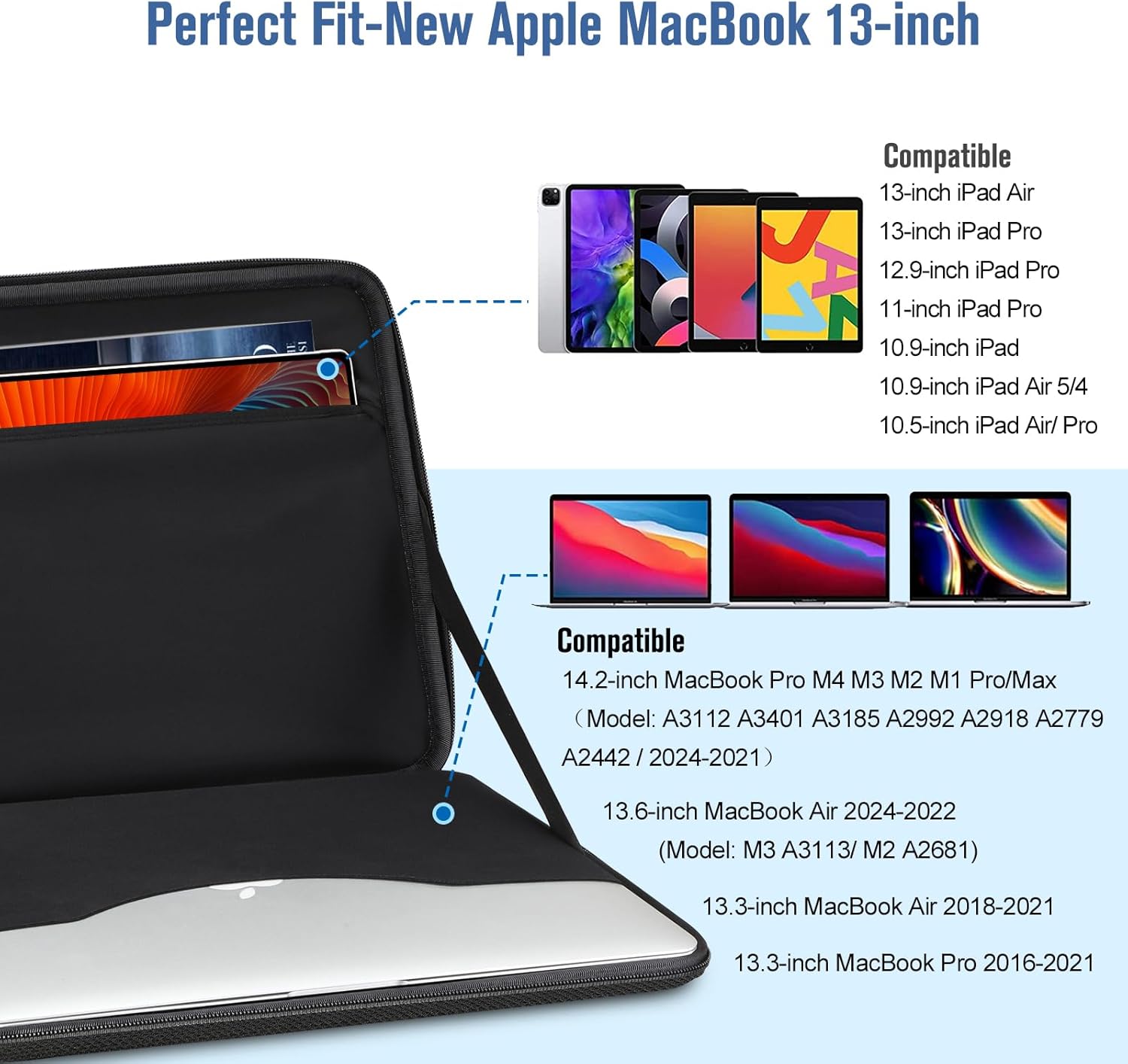 Brede compatibiliteit: Compatibel met 14,2 inch MacBook Pro M1 Pro/Max A2442 2021; 13,6 inch Macbook Air M2 A2681 2022; 13,3 inch MacBook Air M1/A2337 A2179 A1932 (2021-2018); 333333333,3,3,3,3,3,3 inch), 8 cm MacBook Pro M2 M1/A2338 A2251 A2289 A2159 A1989 A1706 A1708 (2022-2016), 12,9 inch iPad Pro 5e/4e/3e generatie (2018-2021); 12,3 inch oppervlak Pro X/7 inch /6/5/4/3/2/1, en andere Samsung/Huawei/Lenovo/Dell/Asus/Acer/Toshiba Notebooks/Tablets tot 13 inch; ook met tabletvak voor 9,7-12,9 inch iPad/iPad pro/iPad Air