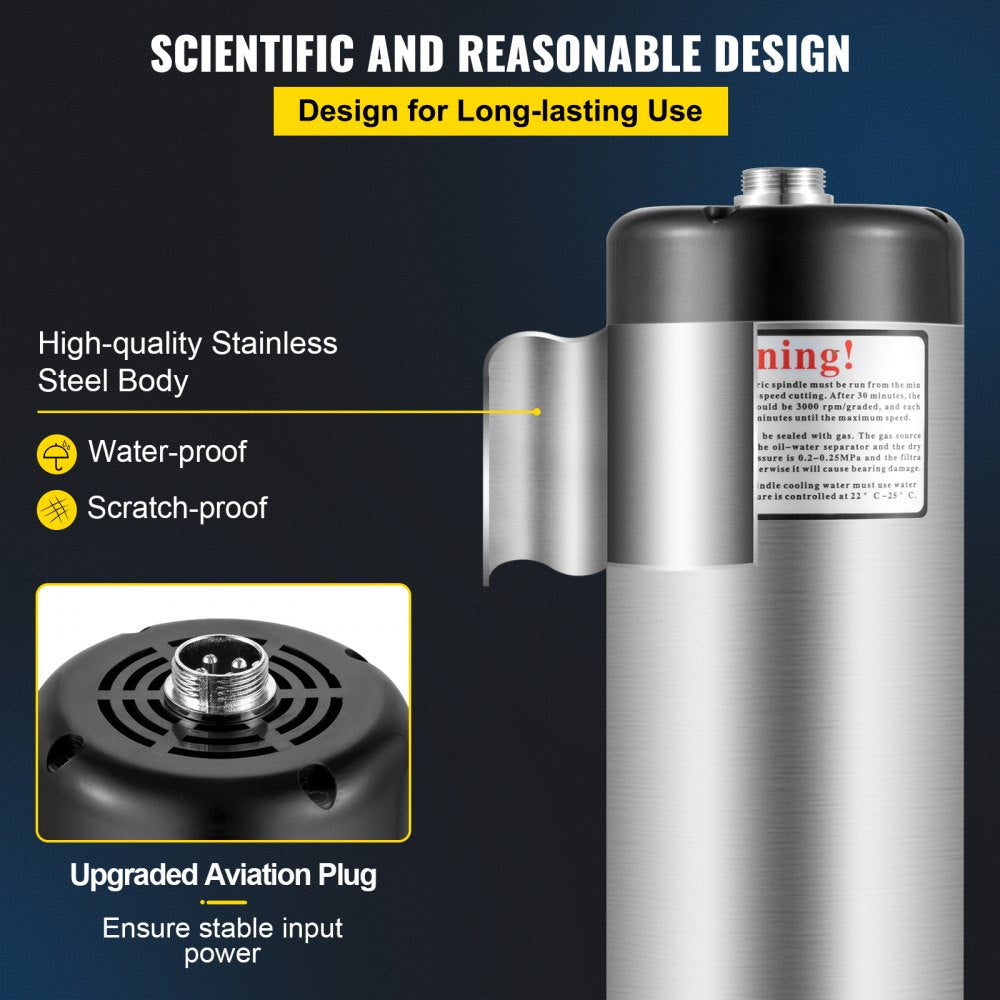 Deze spindelmotoren gebruiken geïmporteerde lagers en hoogwaardige roestvrijstalen materialen en hun levensduur is drie keer die van gewone spindelmotoren. Ze zijn geschikt voor graveermachines voor hout, steen, metaal en andere materialen.