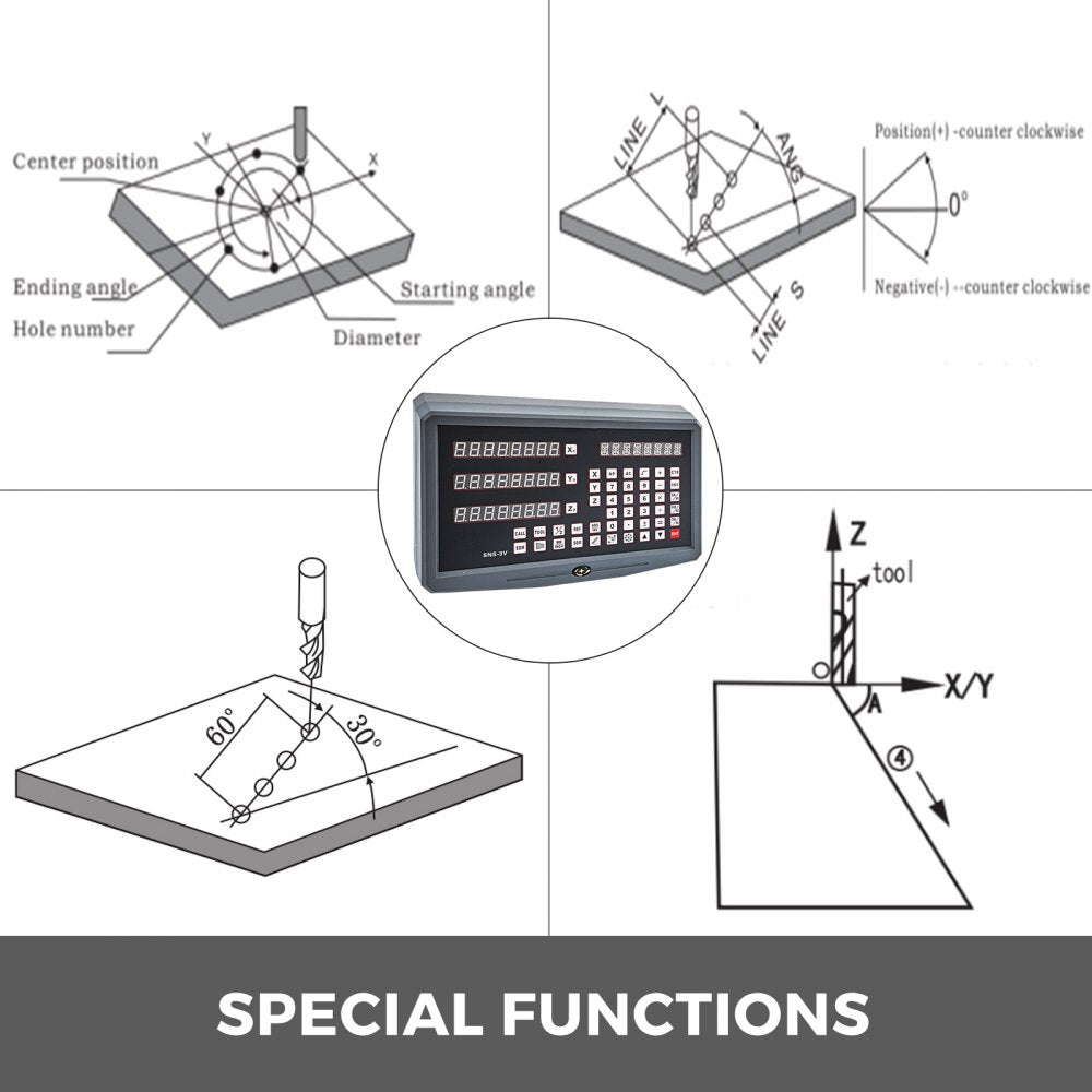 Onze gloednieuwe 3 Axis DRO Digital Readout is een instrument dat de positie van het werkstuk kan meten tijdens de verwerking. Het coördinatensysteem moet eerst definitief zijn voor meer efficiëntie en nauwkeurigheid.
