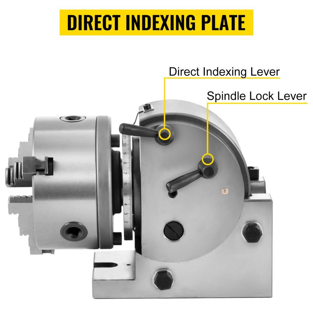Door het 1e niveau te draaien dat de pin extrudeert, gaat de pin in de plaat en kun je de volledige cirkel verdelen in 2, 3, 4, 6, 8, 12 of 24 delen. Het andere niveau voorkomt dat de spil trilt tijdens de bewerking.