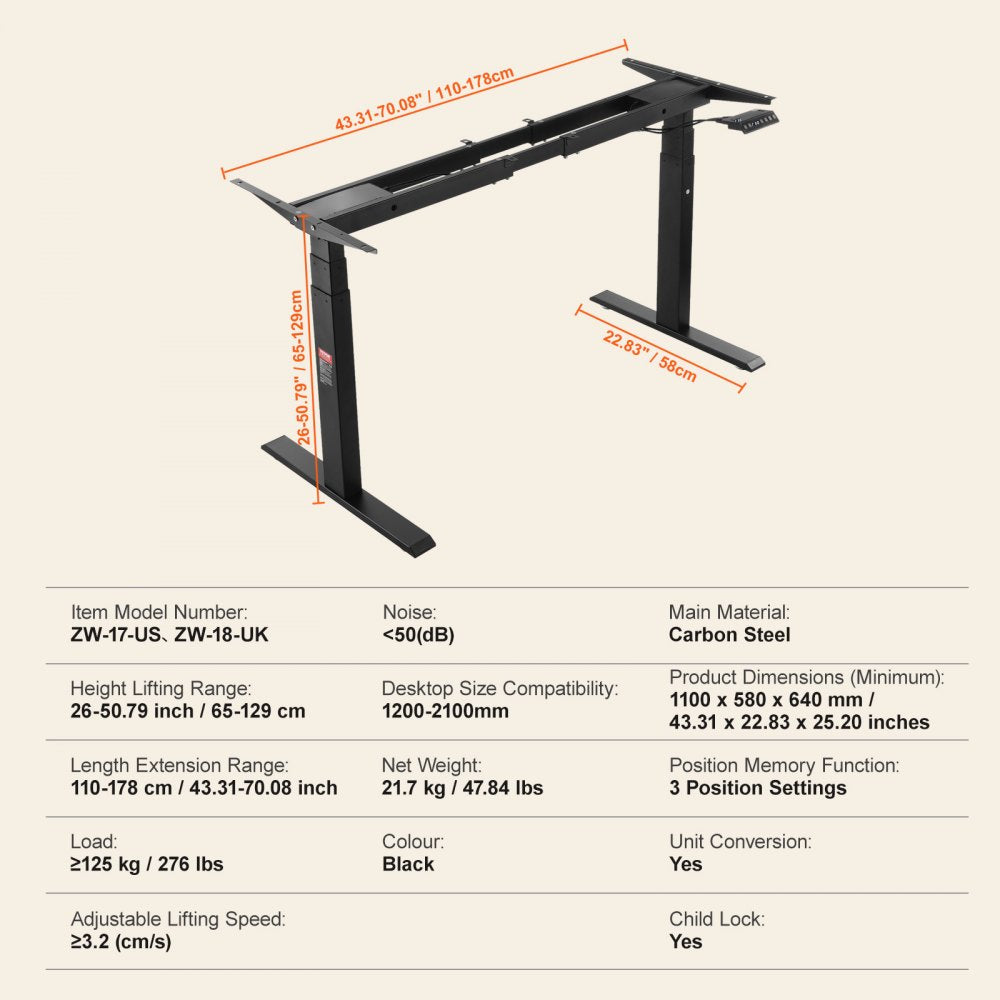 VEVOR bureauframe met dubbele motor, verstelbare hoogte 65-129 cm en lengte 110-178 cm, elektrisch tafelframe, ergonomische werkstationbasis, 3 posities (alleen zwart frame)