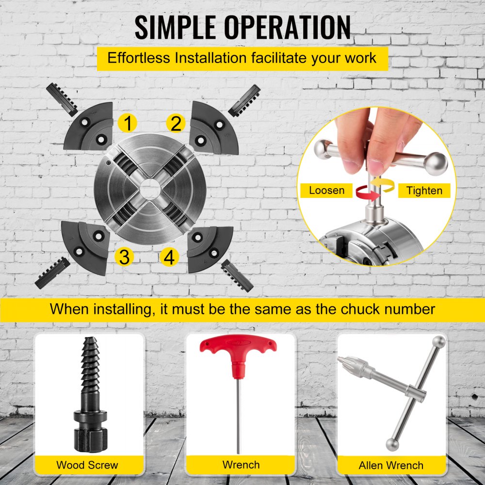 Beschikt over een schroefdraad van 1" x 8 TPI en M33 x 3,5 voor compatibiliteit met de meeste houtdraaibanken op de markt. De klauwplaat wordt gefreesd door freesvaardigheid voor hoge precisie en nauwkeurigheid. Het ziet er beknopter uit.