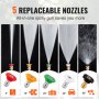 vijf sproeiers voor het VEVOR hogedrukreinigerpistool: krachtig stralen, zwaar belastbaar, algemene reiniging, zacht sproeien en schuimvormend sop.