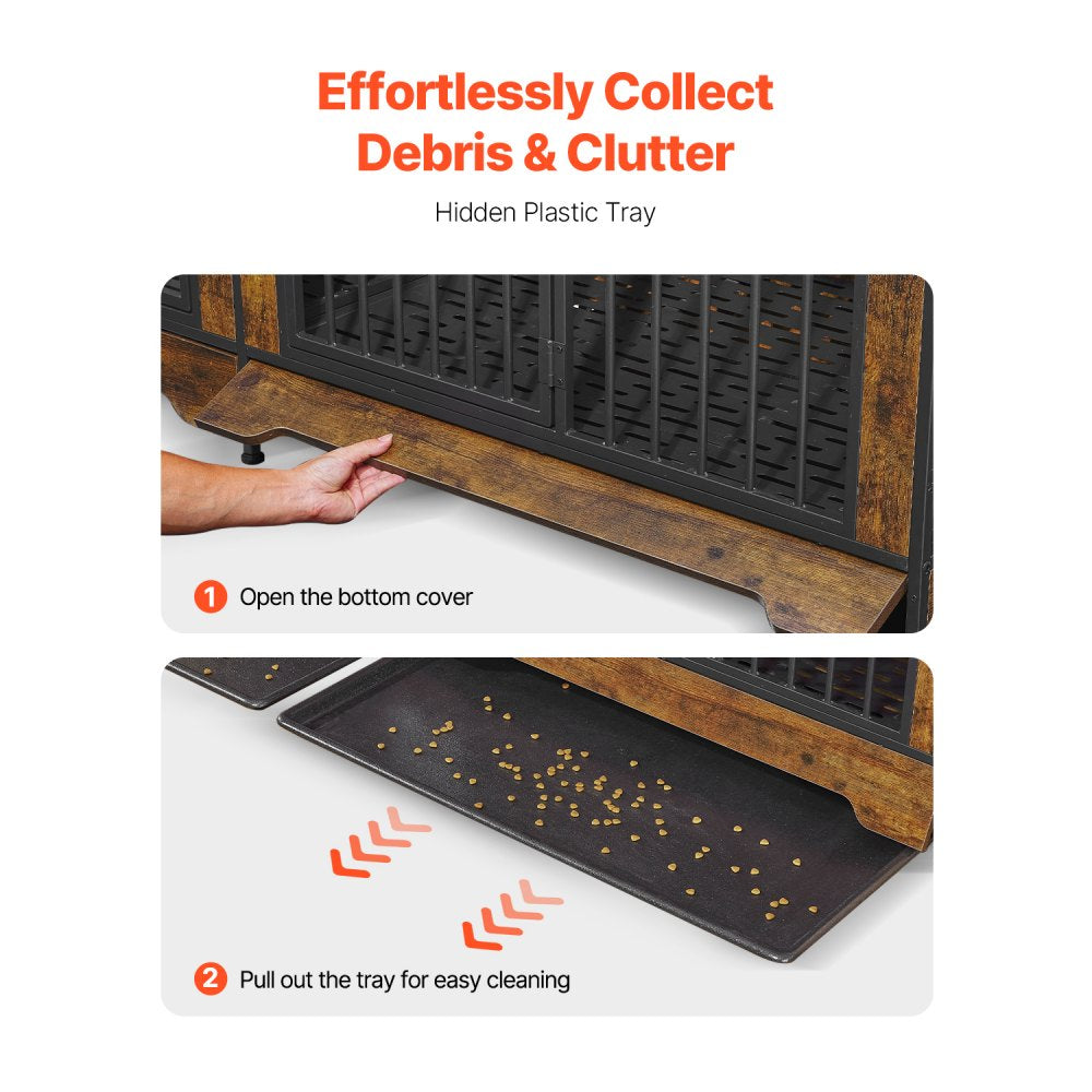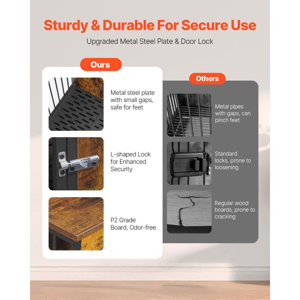 Deze hondenbench in meubelstijl combineert esthetiek en functionaliteit met een versterkt stalen frame, verstelbare scheidingswand, dubbele deuren met veilige sloten en een multifunctioneel deksel.