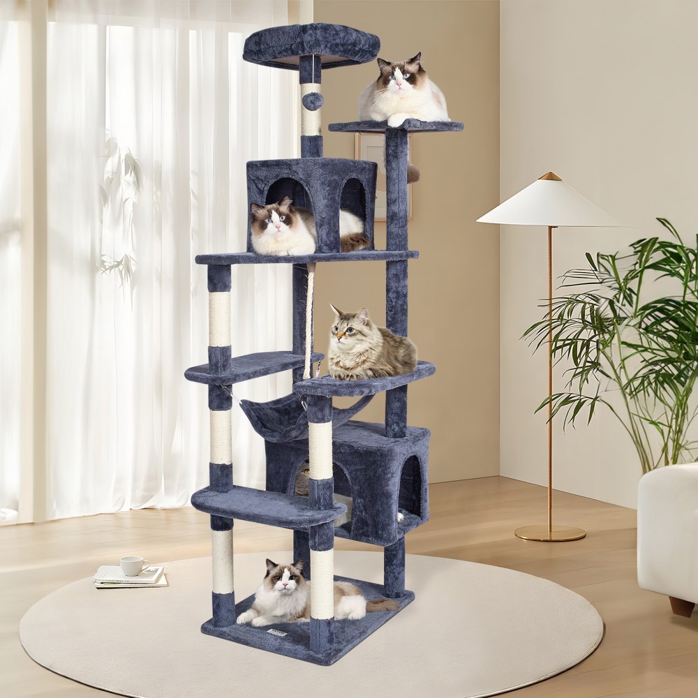 Geef jouw katten een comfortabele leefomgeving op deze kattentoren. Met verschillende rustplekken, waaronder een ruime basis, een knusse hangmat, 2 verborgen kattenverblijven en een zachte zitting waar katten kunnen uitrusten of zich kunnen verstoppen.