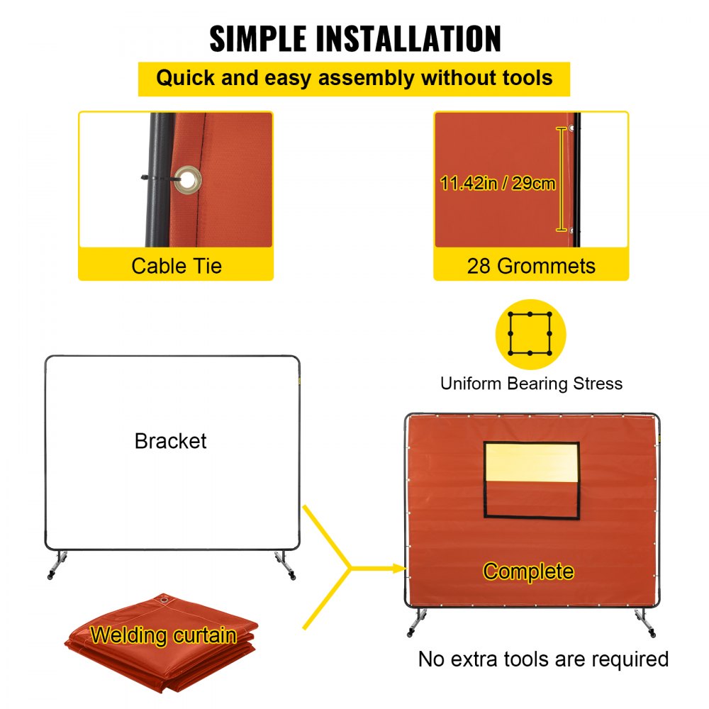 • Stevige Bevestiging: Het lasscherm met frame bevat in totaal 28 doorvoertules, die scheurbestendig zijn. Het grootste gebied reikt tot 6' x 8' voor uitstekende bescherming.