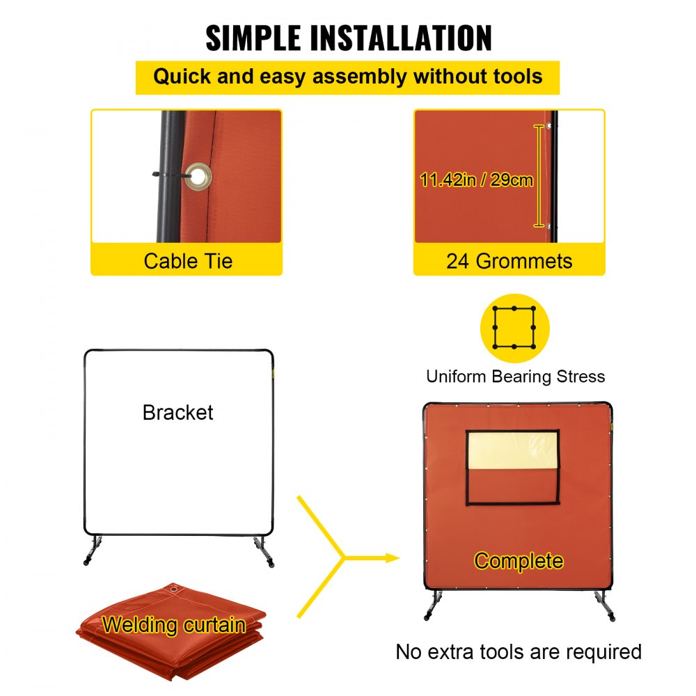 • Stevige Bevestiging: Het lasscherm met frame bevat in totaal 24 doorvoertules, die scheurbestendig zijn. Het grootste gebied reikt tot 6' x 6' voor uitstekende bescherming.