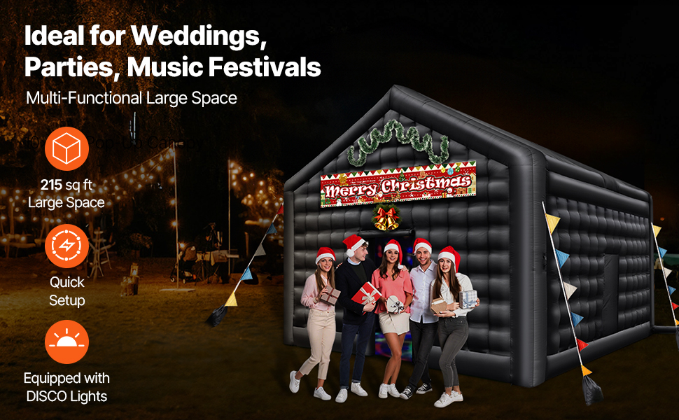 Deze opblaasbare nachtclubtent van 20 m² biedt voldoende ruimte voor levendige evenementen en maakt feesten nog spannender. Ideaal voor bruiloften, bijeenkomsten, verjaardagen en Halloweenfeesten.