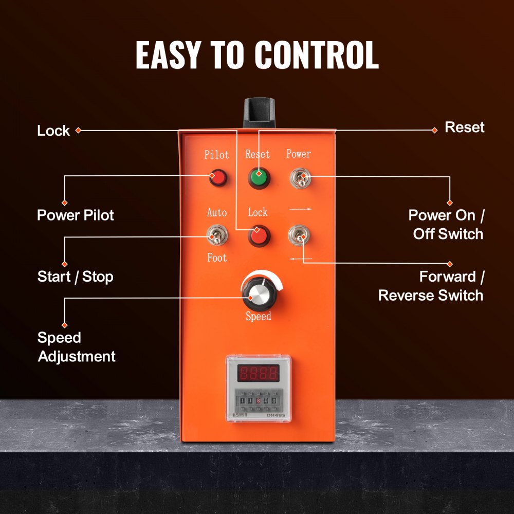 Er zijn 2 bedieningsmodi beschikbaar: een bedieningskast en een voetschakelaar: 1. Kies de automatische modus om de continue rotatie op de ingestelde snelheid te handhaven. 2. Selecteer de voetmodus en gebruik de voetpedaalschakelaar om het stoppen/starten te regelen en de rollen binnen een klein bereik te draaien.