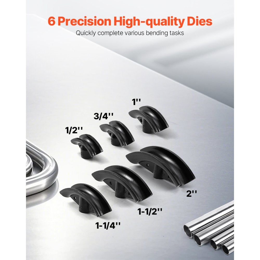 Dit robuuste pijpbuiggereedschap wordt geleverd met 6 precisiegietmatrijzen in de maten 1/2", 3/4", 1", 1-1/4", 1-1/2" en 2". Bovendien zijn de rollen in 6 niveaus verstelbaar om verschillende buighoeken van de pijp aan te kunnen.