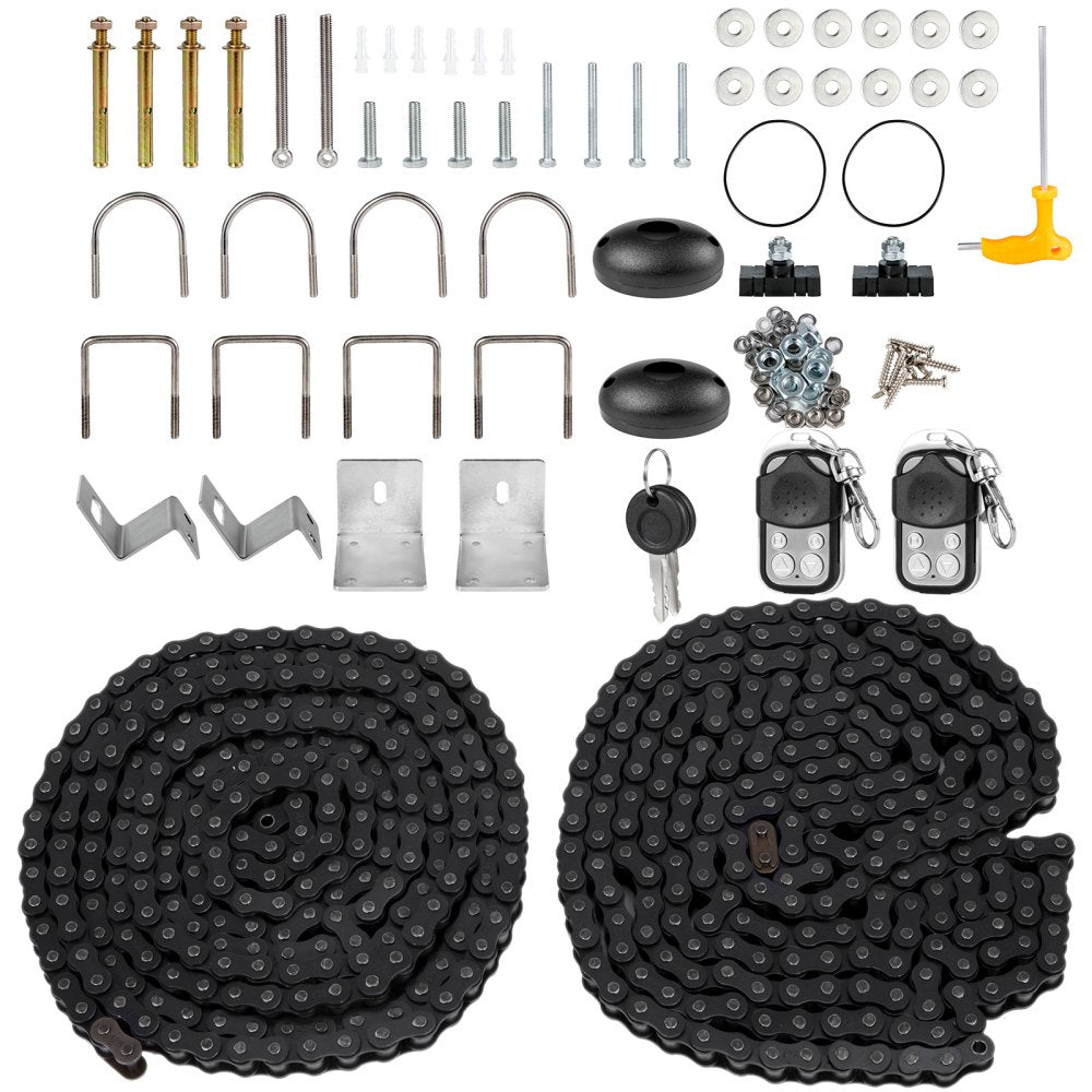 VEVOR schuifpoortopener met hardware, afstandsbedieningen, schroeven, U-bouten en kettingen.