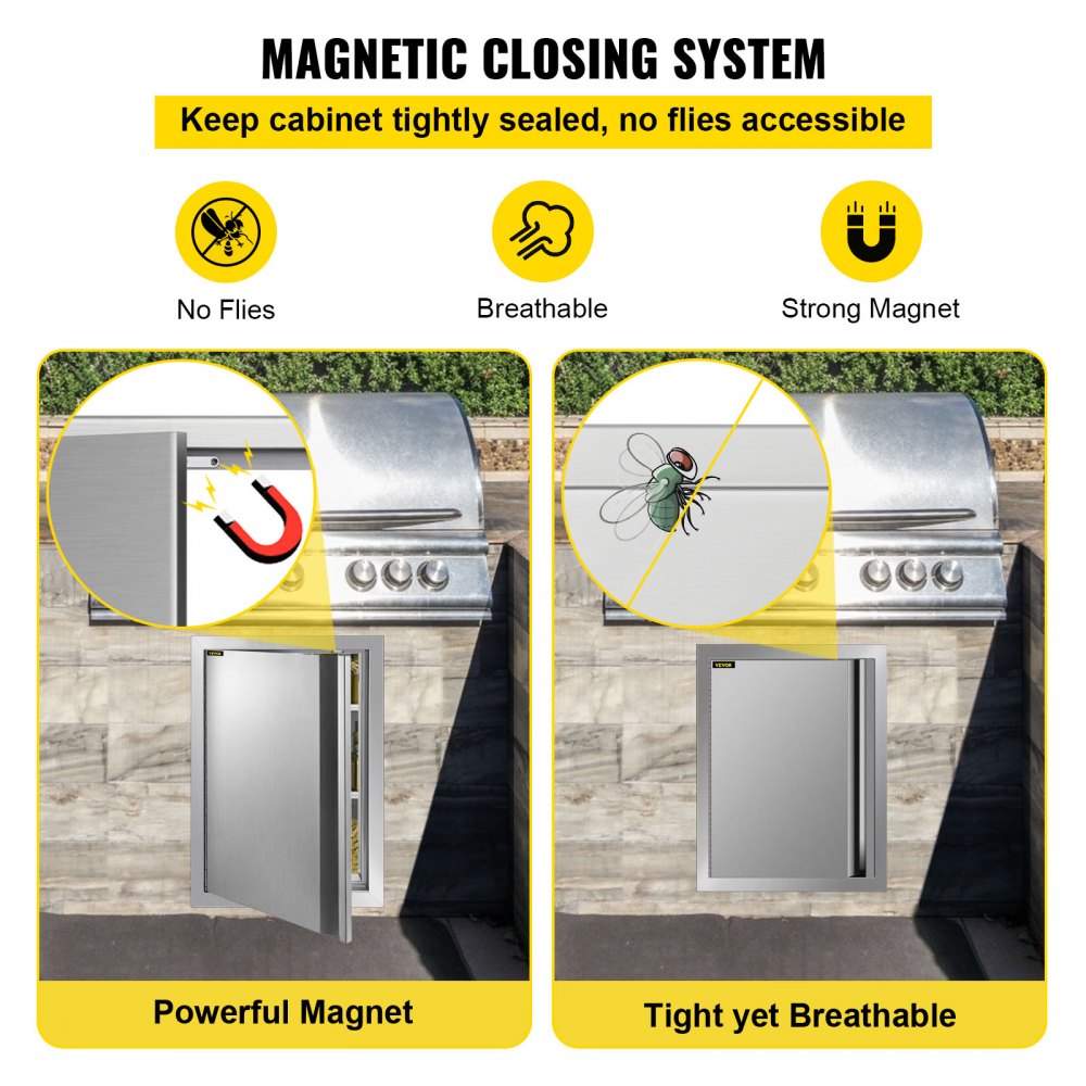 Onze BBQ-eilanddeur is goed afgesloten met twee krachtige magneten op de bovenste en onderste frames. Er kunnen dus geen vliegen of kleine dieren bij je eten of wat dan ook in de kast.