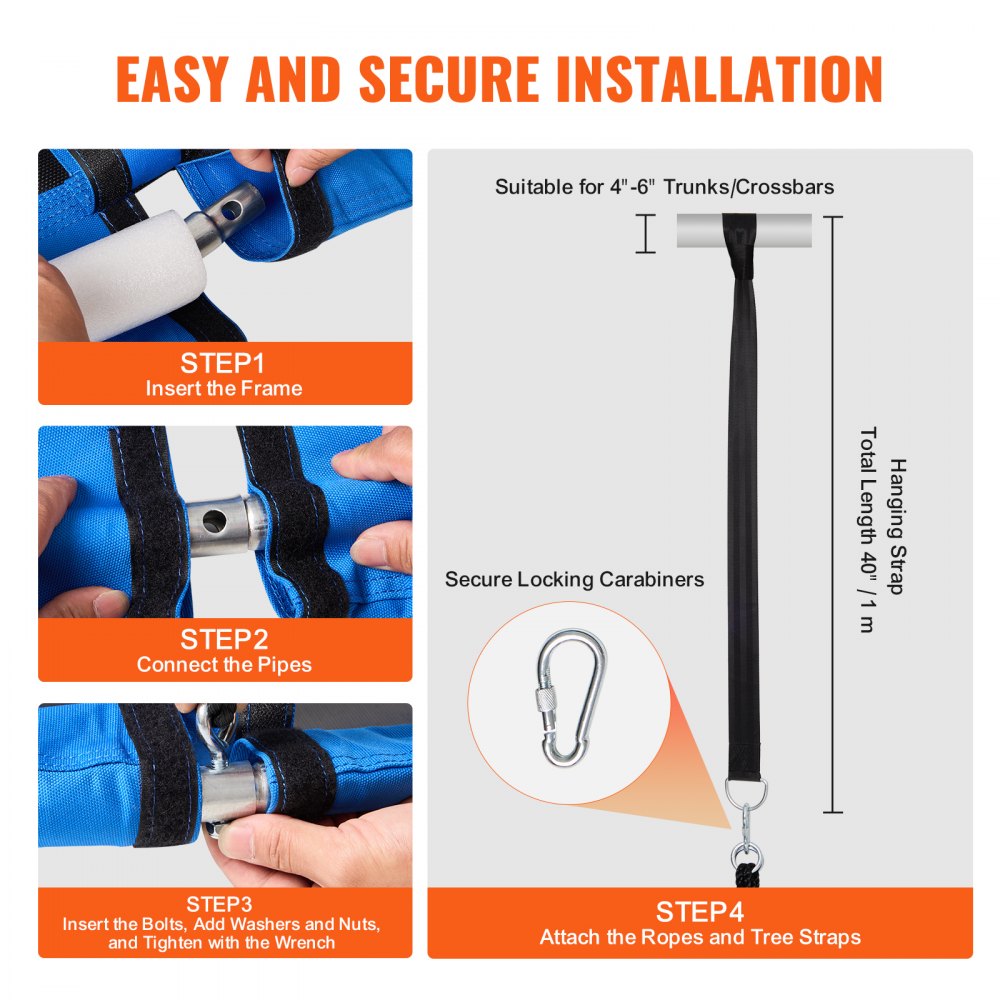 • 900D Blue Oxford-stof: het blauwe schommelzitje is gemaakt van 900D nylon met hoge dichtheid. Dit duurzame materiaal is stevig en bestand tegen dagelijks gebruik en slijtage buitenshuis. Het biedt een lange levensduur zonder te vervagen. De framebuizen zijn gemaakt van gegalvaniseerd staal met een zachte schuimlaag die het comfort en de veiligheid van kinderen garandeert. Het schommelzitje is bevestigd met vier gelijkmatig belaste gegalvaniseerde stalen bouten die roestbestendig zijn en de schommel stabiel houden.