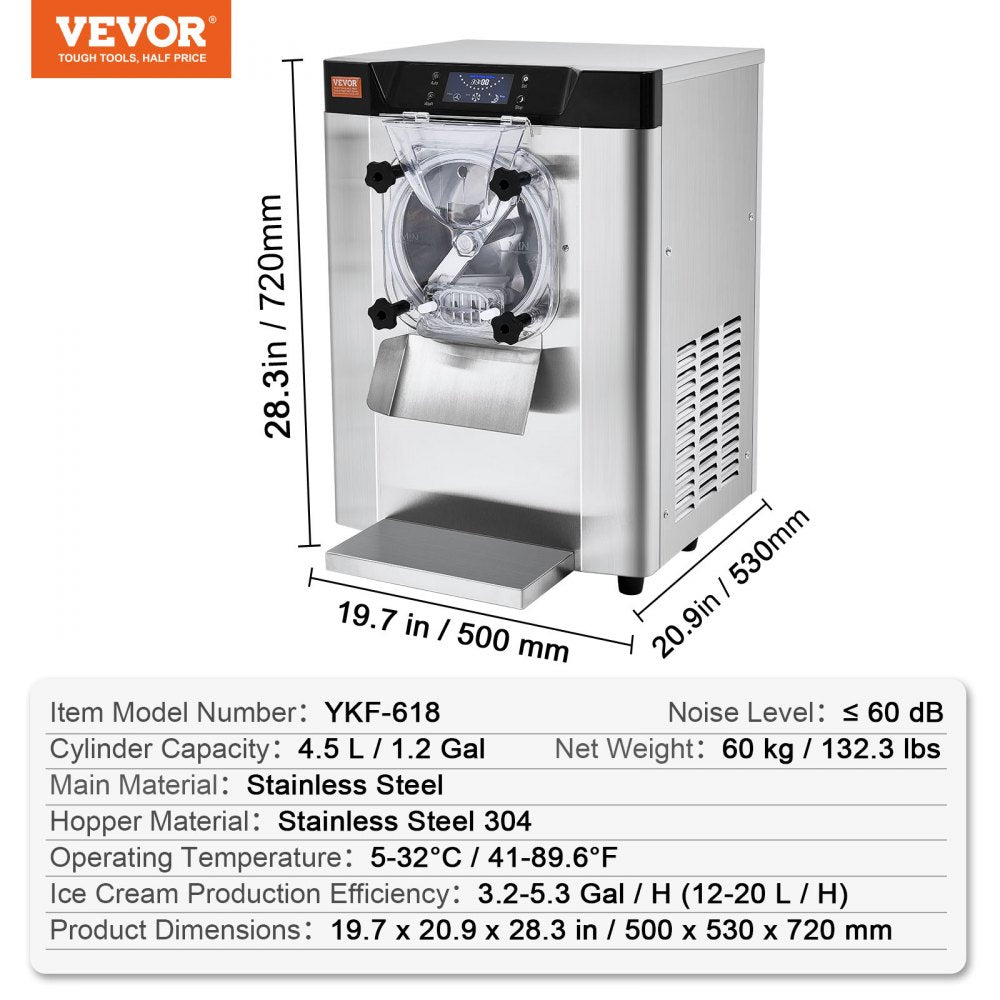 VEVOR Commerciële ijsmachine, 12L/H ijsmachine op aanrecht met enkele smaak voor harde porties, 4,5 liter roestvrijstalen cilinder, LED-paneel, automatische voorkoeling met reiniging