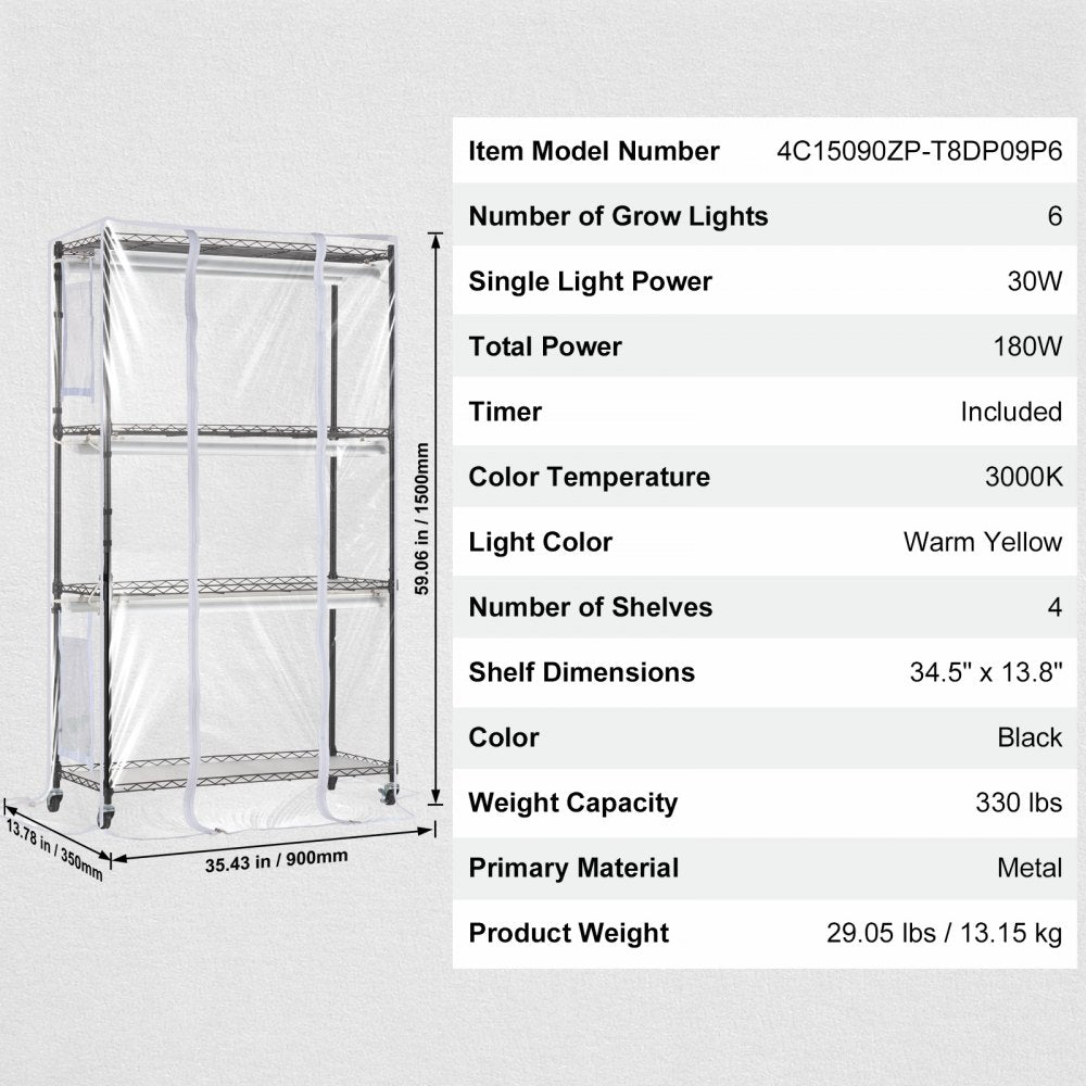 Dit plantenrek is voorzien van 180W LED panelen met een volledig spectrum van 400-780nm. Hij is gemaakt van hoogwaardig staal en meet 89,9 x 35,7 x 150 cm. Met 4 planken en een draagvermogen van 150 kg biedt hij veel ruimte voor planten in een compacte ruimte.