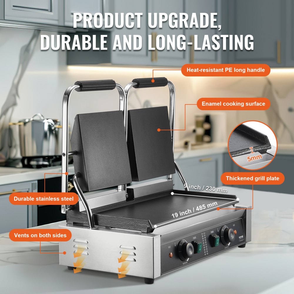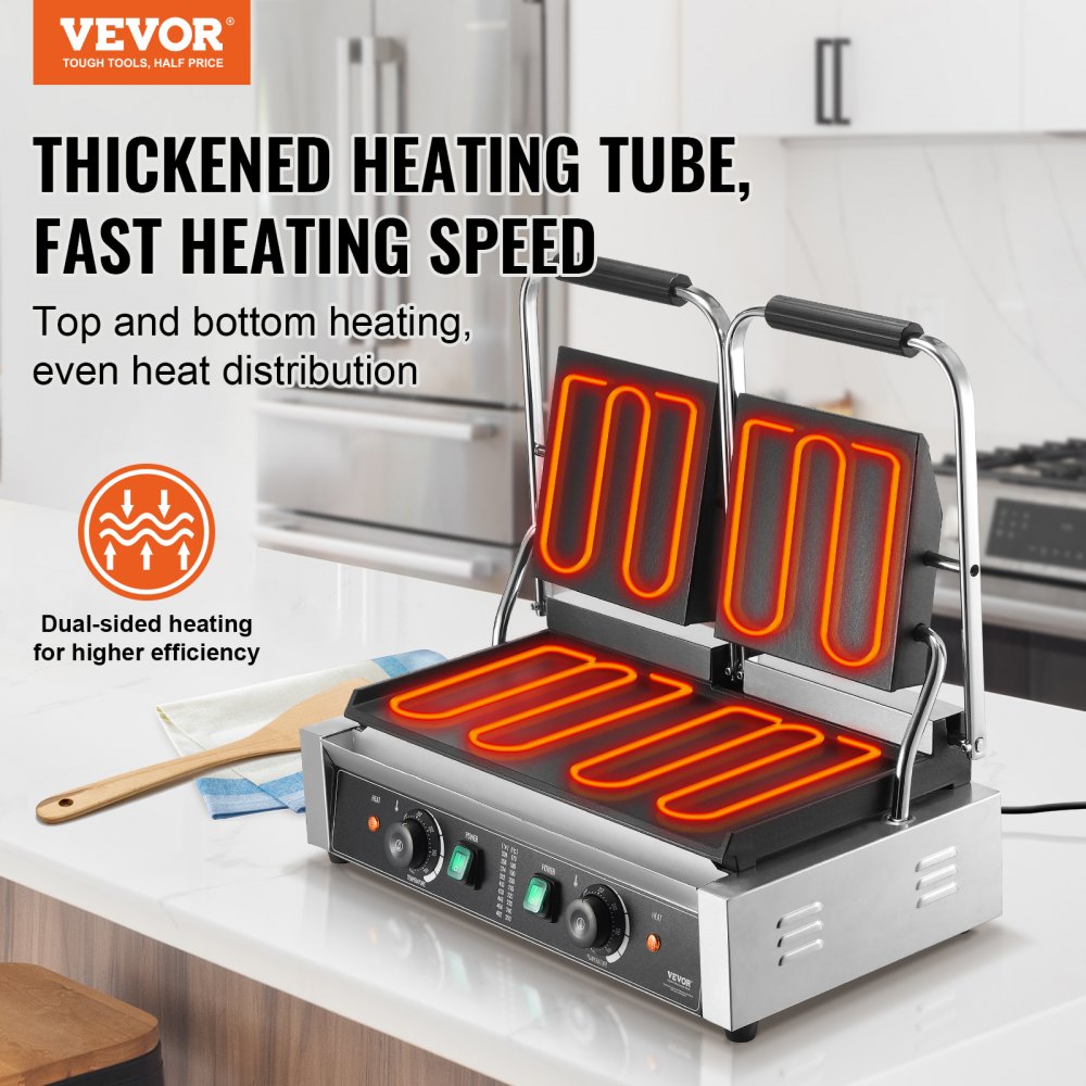 VEVOR panini-pers met nauwkeurig temperatuurregelsysteem, eenvoudige bediening en hoge temperatuurbestendigheid.