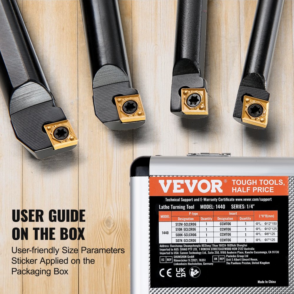 VEVOR draaibankgereedschaphouderset van 4 met sclcr06-wisselplaten, gedetailleerde specificatietabel.