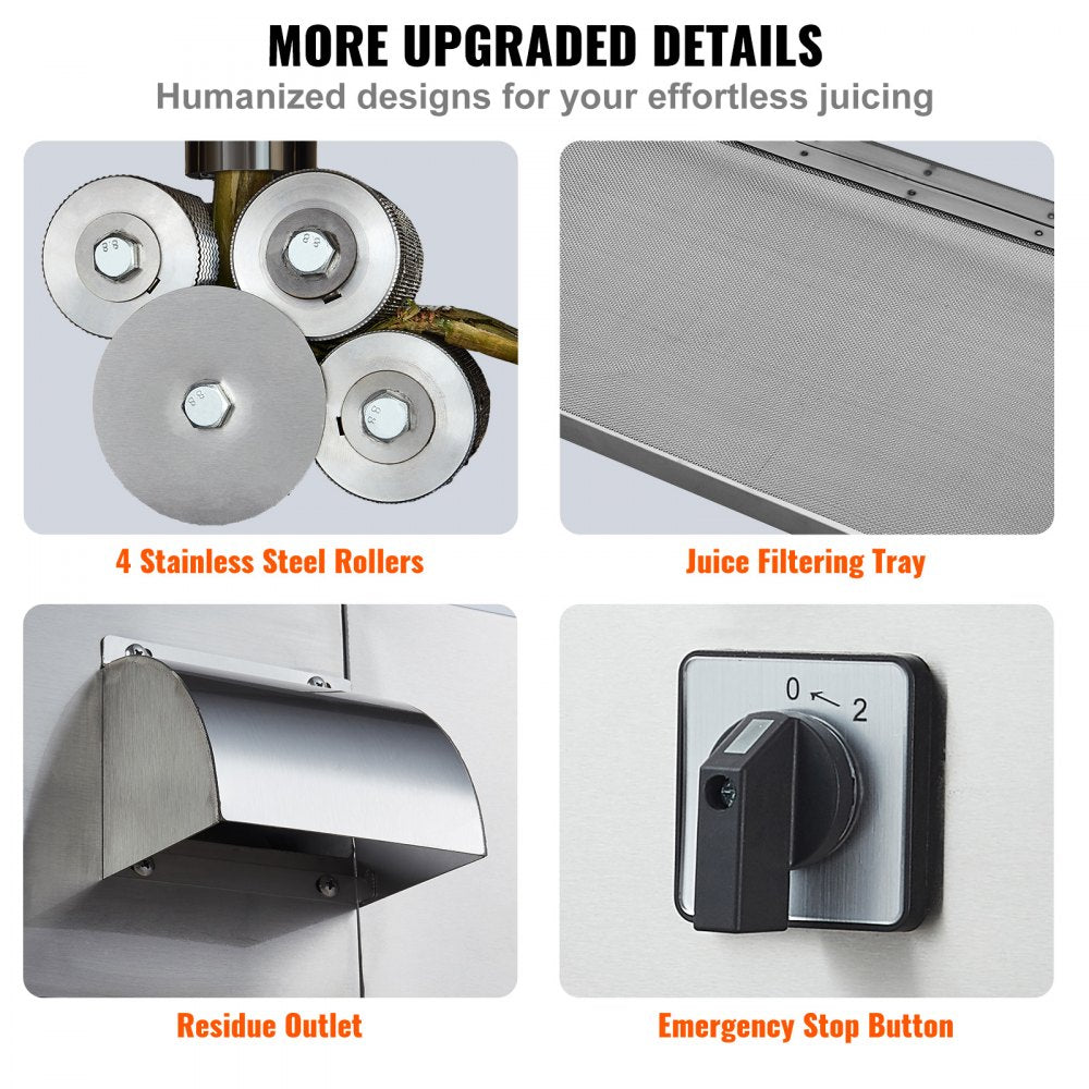 De VEVOR suikerrietpers is voorzien van rubberen voetjes voor een veilige stand. Het kan op verschillende manieren worden gebruikt voor drankenmarkten, buitenkraampjes, fruitverkopers, hotelkeukens en nog veel meer. Geniet waar en wanneer je maar wilt van heerlijk suikerrietsap.